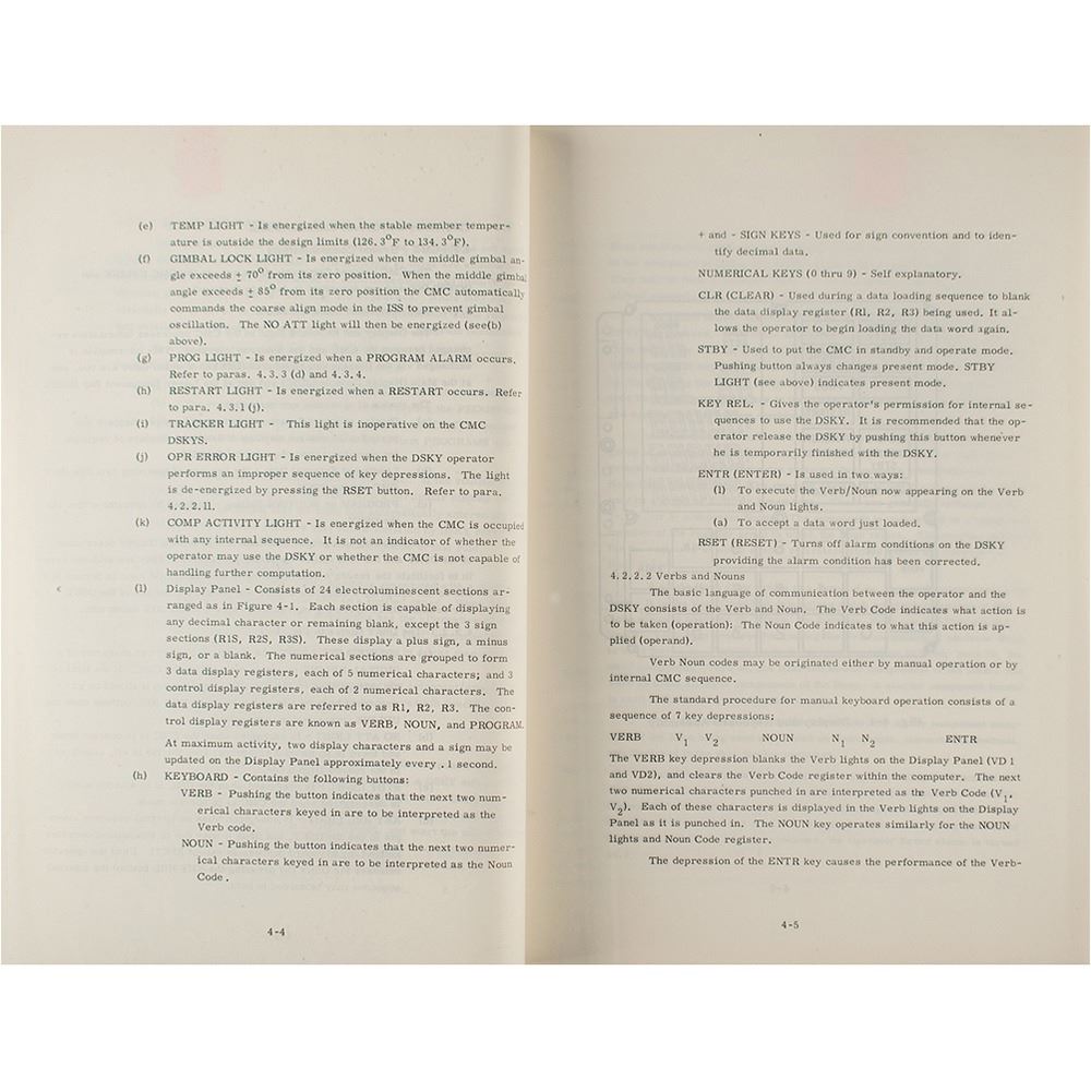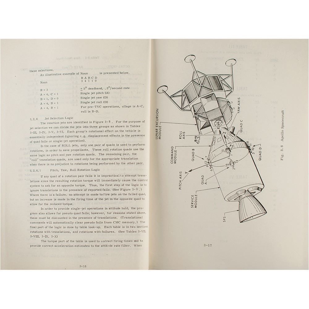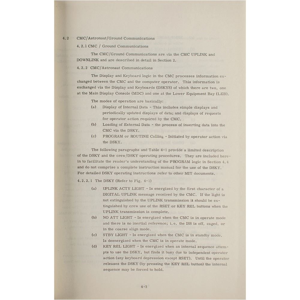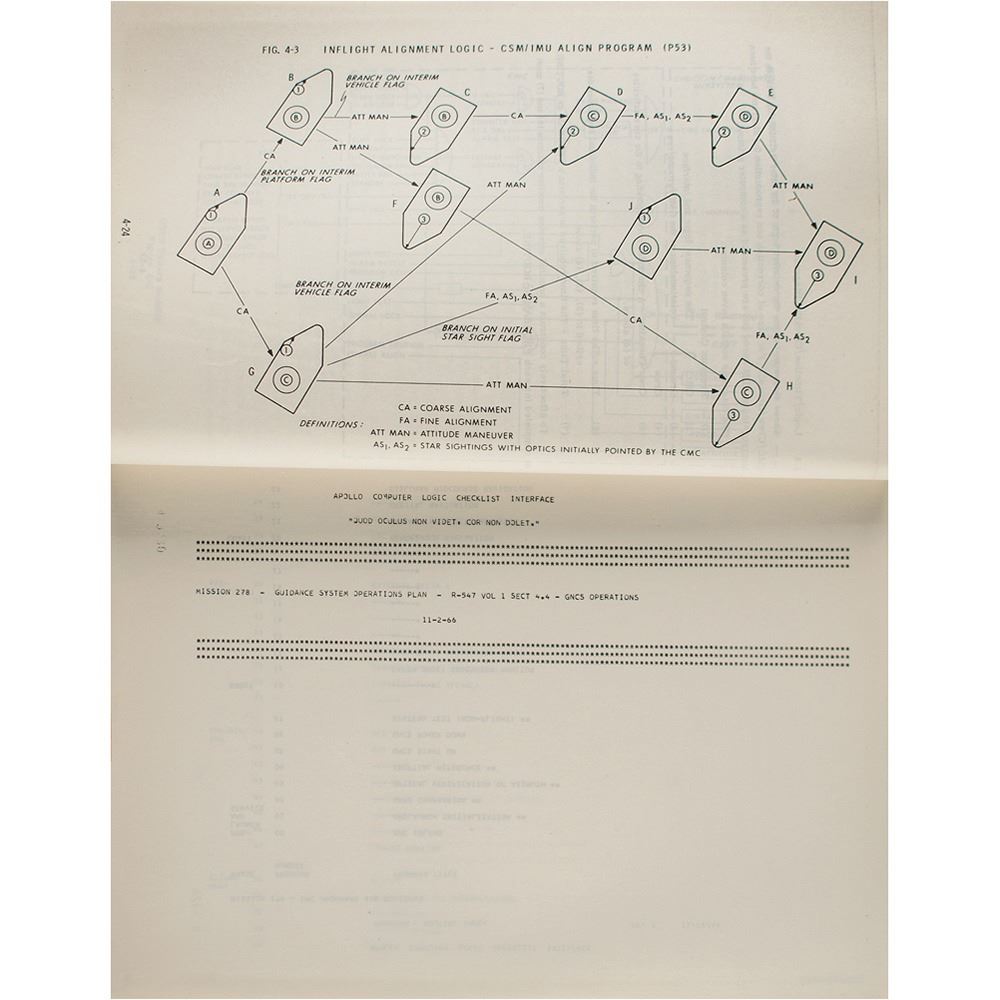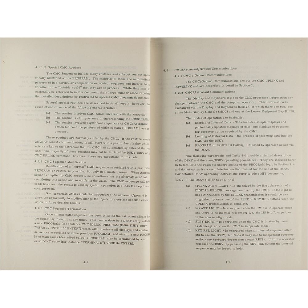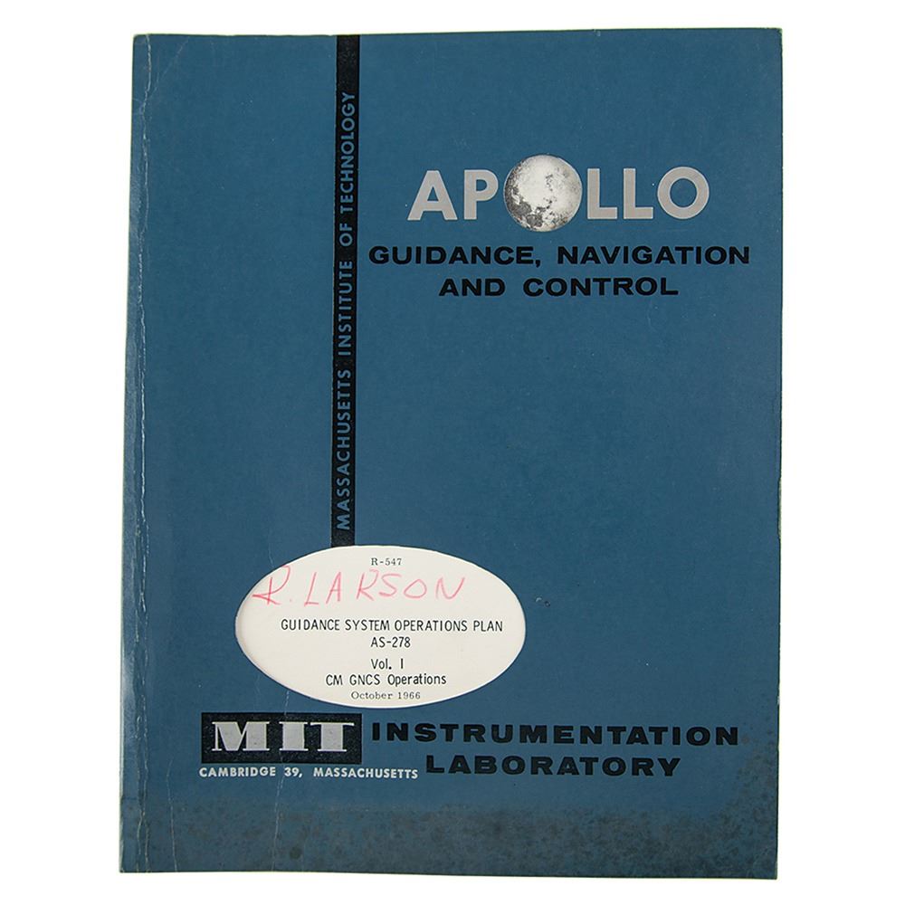 Significant bracket-bound manual from the MIT Instrumentation Laboratory entitled "R-547, Guidance System Operations Plan, AS-278, Vol. I, CM GNCS Operations, October 1966," bound in its original blue "Apollo Guidance, Navigation and Control" softcover wrappers, 8.5è x 11è x 1.5è, marked "R. Larson" on the title page. The introduction defines the plan's purpose: "This plan governs the operation of the Command Module Guidance, Navigation and Control System and defines its functional interface with the spacecraft, flight crew, and ground support systems on Apollo Mission AS-278." The plan offers a detailed outline of the Command Module's Guidance, Navigation, and Control System (GNCS) operations, detailing data links, digital autopilot, operational modes, and guidance equations. The "operational modes" section includes a detailed discussion of the form and function of the Apollo Display and Keyboard (DSKY), the interface through which the astronauts interacted with the onboard computer. The plan also includes lengthy printouts of program and routine listings as part of the "Apollo Computer Logic Checklist Interface." In very good to fine condition, with some creasing and soiling to covers.