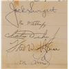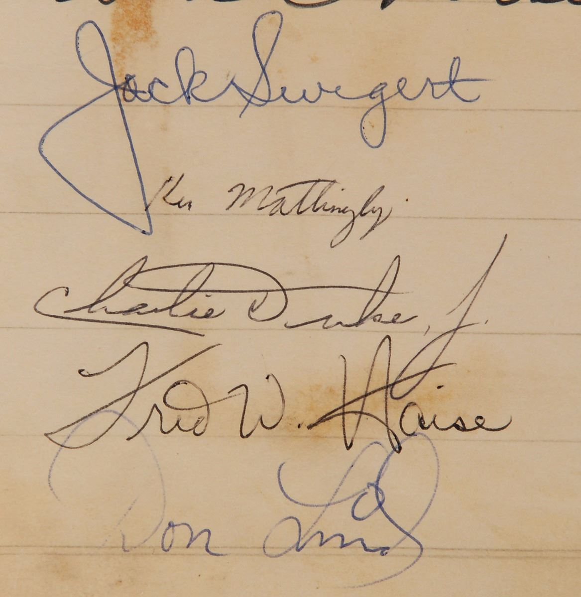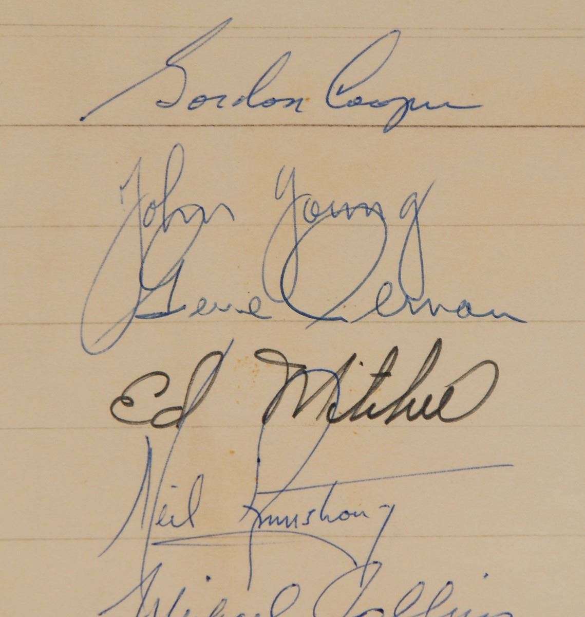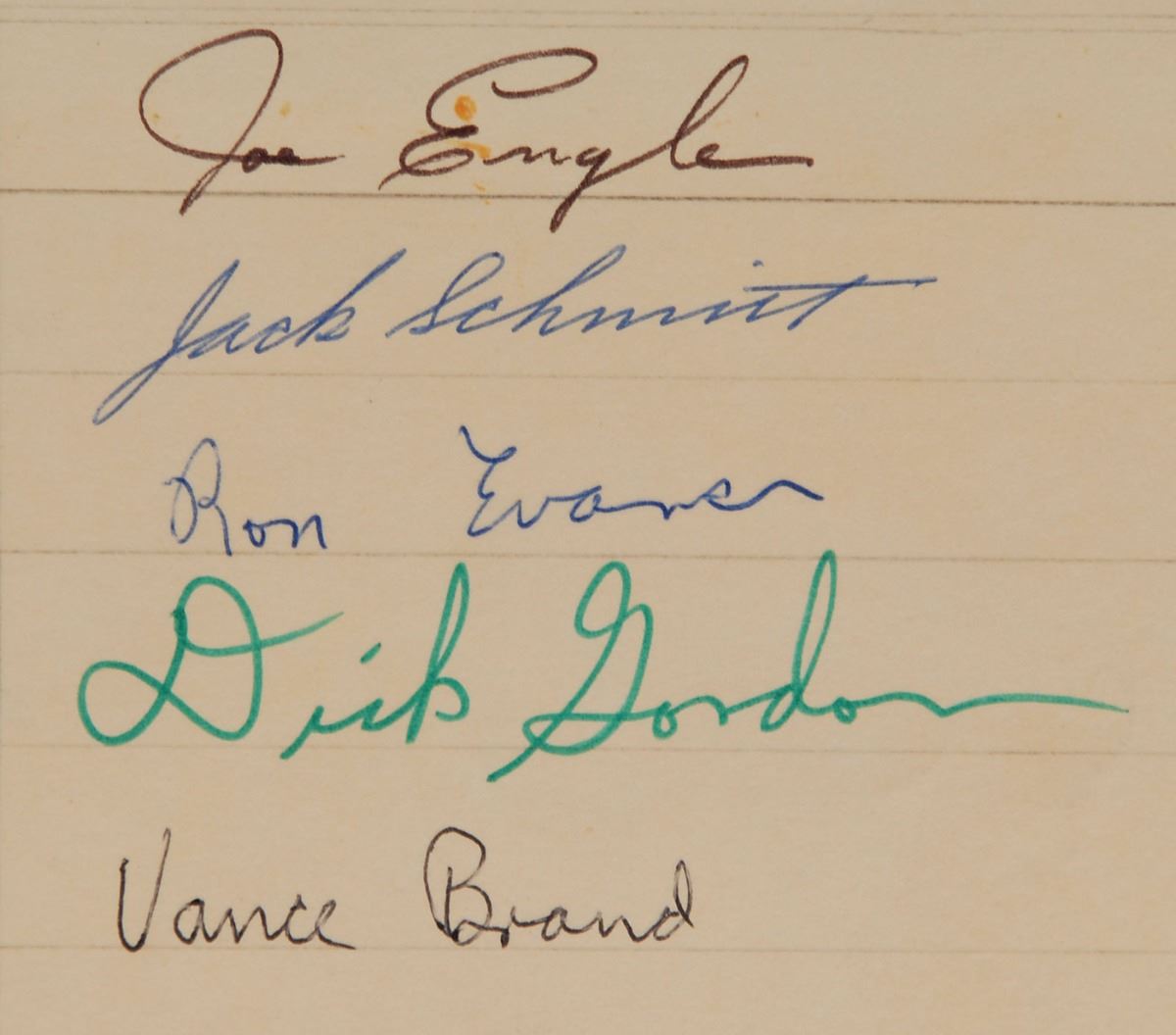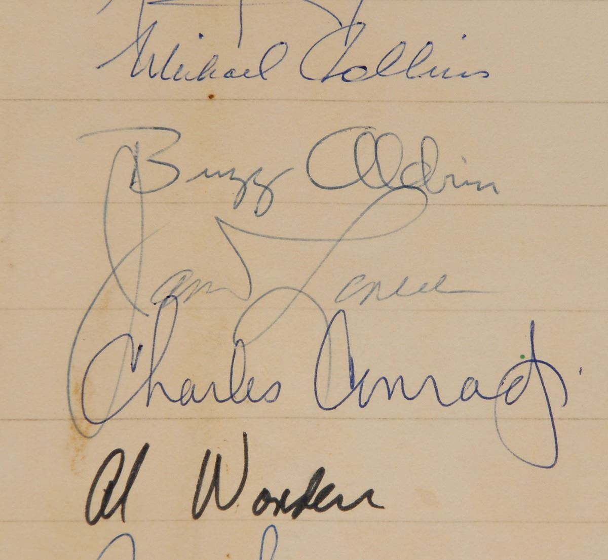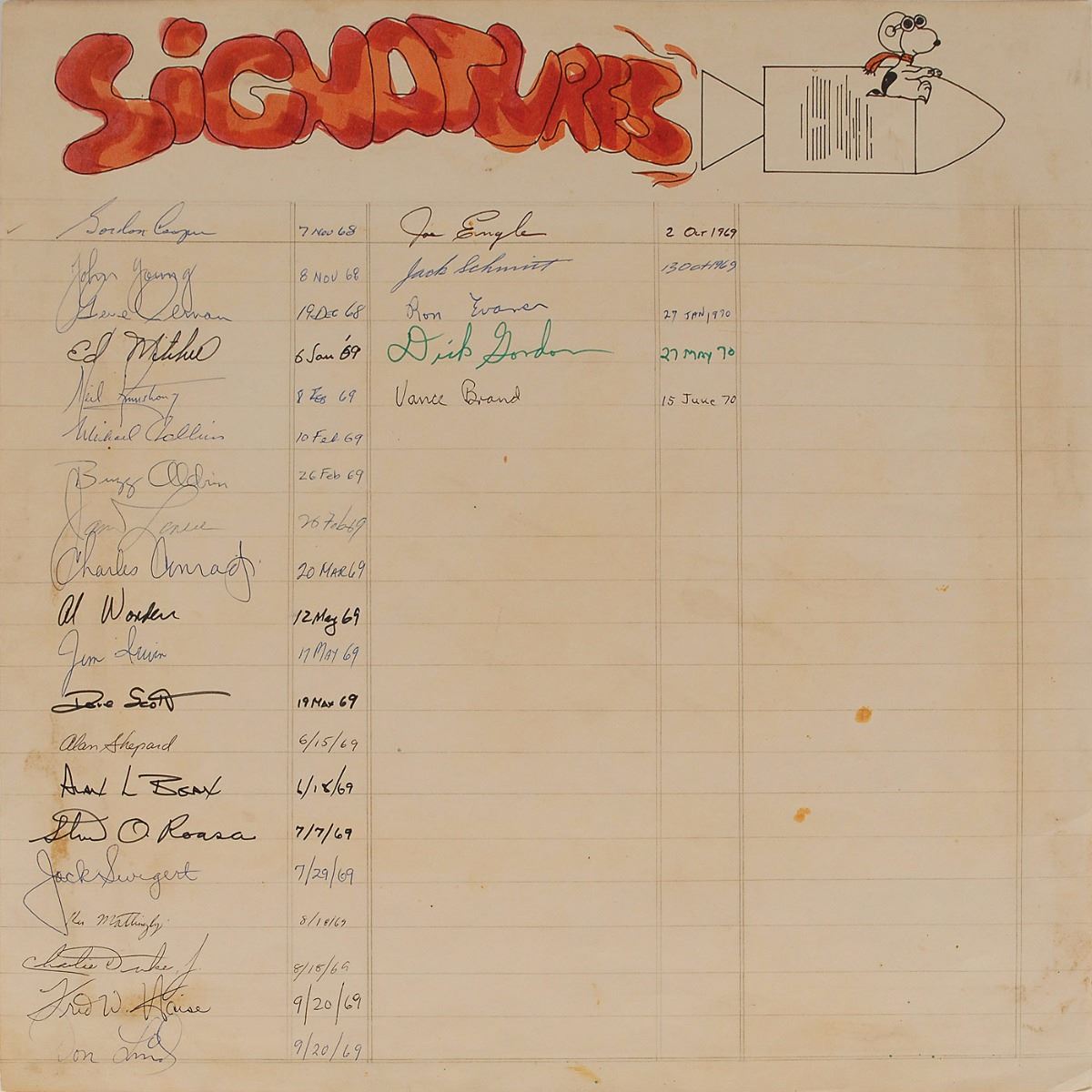 Vintage circa 1969 felt tip and ballpoint signatures of 25 astronauts on a 16 x 16 sheet, including: Neil Armstrong, Buzz Aldrin, Michael Collins, Alan Bean, Charles Conrad, Richard Gordon, James Lovell, Jack Swigert, Fred Haise, Alan Shepard, Edgar Mitchell, Stu Roosa, Dave Scott, Jim Irwin, Al Worden, John Young, Charlie Duke, Ken Mattingly, Gene Cernan, Harrison Schmitt, Ron Evans, Gordon Cooper, Don Lind, Joe Engle, and Vance Brand. The signatures are dated between November 1968 and June 1970, with the majority from 1969; the Apollo 11 signatures date to February 1969, five months before their historic mission. The scrapbook page is hand-embellished with a header and sketch of Snoopy riding an Apollo spacecraft. In very good condition, with some scattered staining (primarily from toned adhesive to reverse). These autographs were obtained by a longtime employee of ILC Industries in Dover, Delaware, which has developed space suits for NASA since the Apollo era. Featuring the complete crew of every planned lunar landing—Apollo 11 through 17—this is a remarkable compilation of vintage signatures from the period of these historic missions.