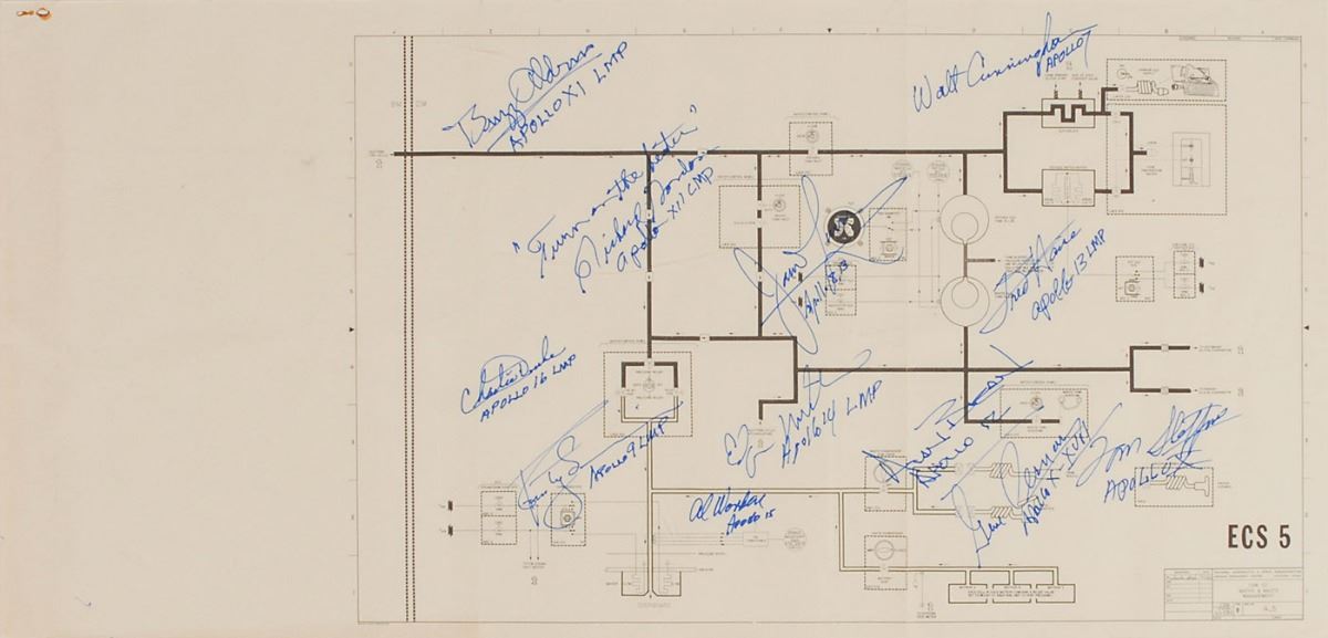 Schematic for the CSM-101 Water & Waste Management systems, one page, 22 x 10.5, signed in blue felt tip, “Buzz Aldrin, Apollo XI LMP,” “‘Turn on the heater,’ Richard Gordon, Apollo XII CMP,” “Charlie Duke, Apollo 16 LMP,” “Rusty Schweickart, Apollo 9 LMP,” “Al Worden Apollo 15,” “Edgar Mitchell, Apollo 14 LMP,” “James Lovell, Apollo 8, 13,” “Walt Cunningham, Apollo 7,” “Fred Haise, Apollo 13 LMP,” “Alan Bean, Apollo 12,” “Gene Cernan, Apollo X–XVII,” and “Tom Stafford Apollo X.” The schematic details the various pathways and processes of the command module’s water and waste control. Rolled and in fine condition, with a few creases and rusty paperclip holes to upper left corner tip. Originating from the Astronaut Scholarship Foundation, a portion of the proceeds for the sale of this item will be donated to the ASF.