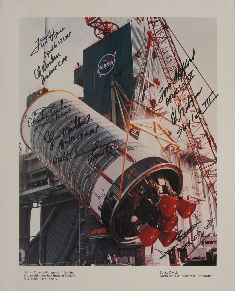 Uncommon color 12.25 x 15 print of a Saturn V Second Stage hoisted into position for test firing at NASA’s Mississippi Test Facility, prepared by the Space Division at North American Rockwell Corporation, signed in black felt tip, “Fred Haise, Apollo 13 LMP,” “Al Worden, Apollo 15 CMP,” “Charlie Duke, Apollo 16 LMP,” “Edgar Mitchell, Apollo 14 LMP,” “Walt Cunningham, Apollo 7,” “Tom Stafford, Apollo X,” “Ed Gibson, Skylab III,” and “Alan Bean, Apollo 12 LMP.” In fine condition. Originating from the Astronaut Scholarship Foundation, a portion of the proceeds for the sale of this item will be donated to the ASF.