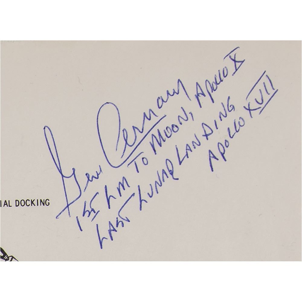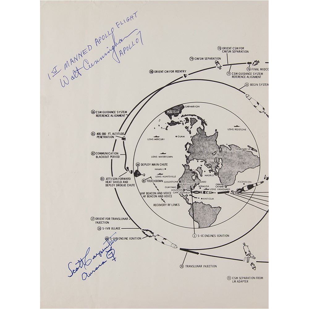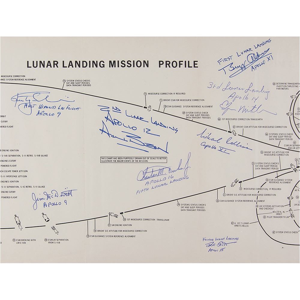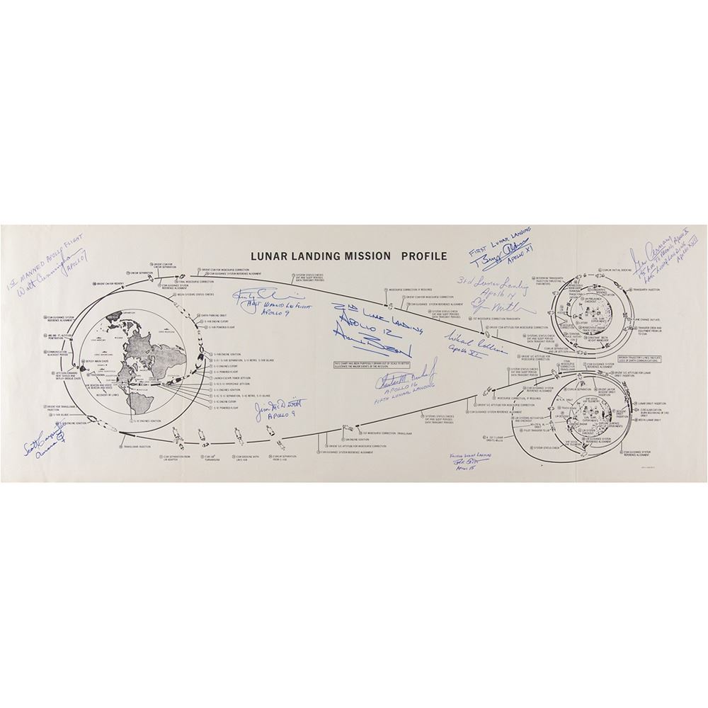 Spectacular oversized 30 x 11 chart entitled "Lunar Landing Mission Profile," published in 1969 by the Government Printing Office, beautifully signed in ink by at least one member of every successful Apollo lunar landing mission: "1st manned Apollo flight, Walt Cunningham, Apollo 7," "Rusty Schweickart, First Manned LM Flight, Apollo 9," "Jim McDivitt, Apollo 9," "First Lunar Landing, Buzz Aldrin, Apollo XI," "Michael Collins, Apollo XI," "2nd lunar landing, Alan Bean, Apollo 12," "3rd Lunar Landing, Apollo 14, Edgar Mitchell," "Fourth Lunar Landing, Dave Scott, Apollo 15," "Charles M. Duke, Jr., Apollo 16, Fifth Lunar Landing," and "Gene Cernan, 1st LM to Moon, Apollo X, Last Lunar Landing, Apollo XVII." Additionally signed by a Mercury astronaut, "Scott Carpenter, Aurora 7." The detailed, impressive chart features an eighty-five step diagram illustrating key steps involved in an Apollo lunar landing mission, from the Saturn V liftoff, to landing on the moon, to splashdown back on Earth. Rolled and in fine condition, with vertical machine folds as issued.