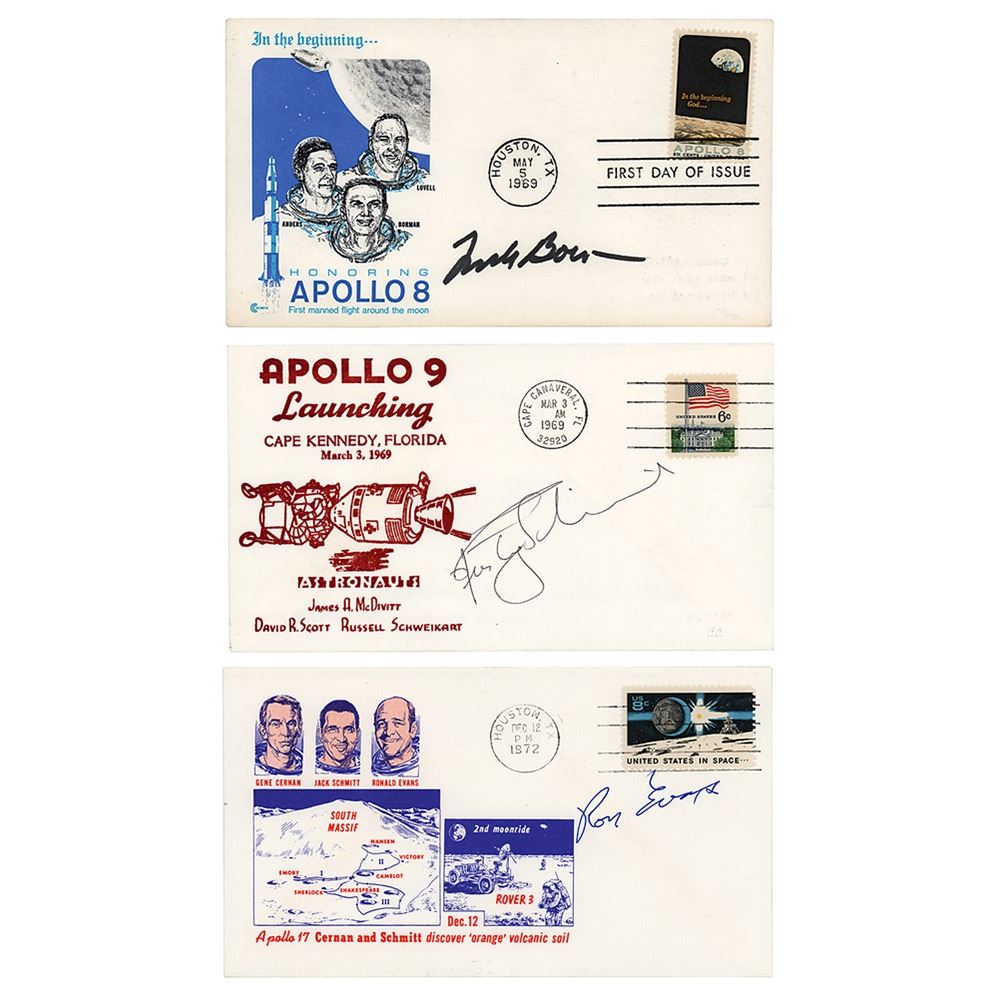 Three commemorative covers honoring Apollo missions, each signed by a member of the crew. Signers are: Frank Borman (Apollo 8), Rusty Schweickart (Apollo 9), and Ron Evans (Apollo 17). In fine condition.