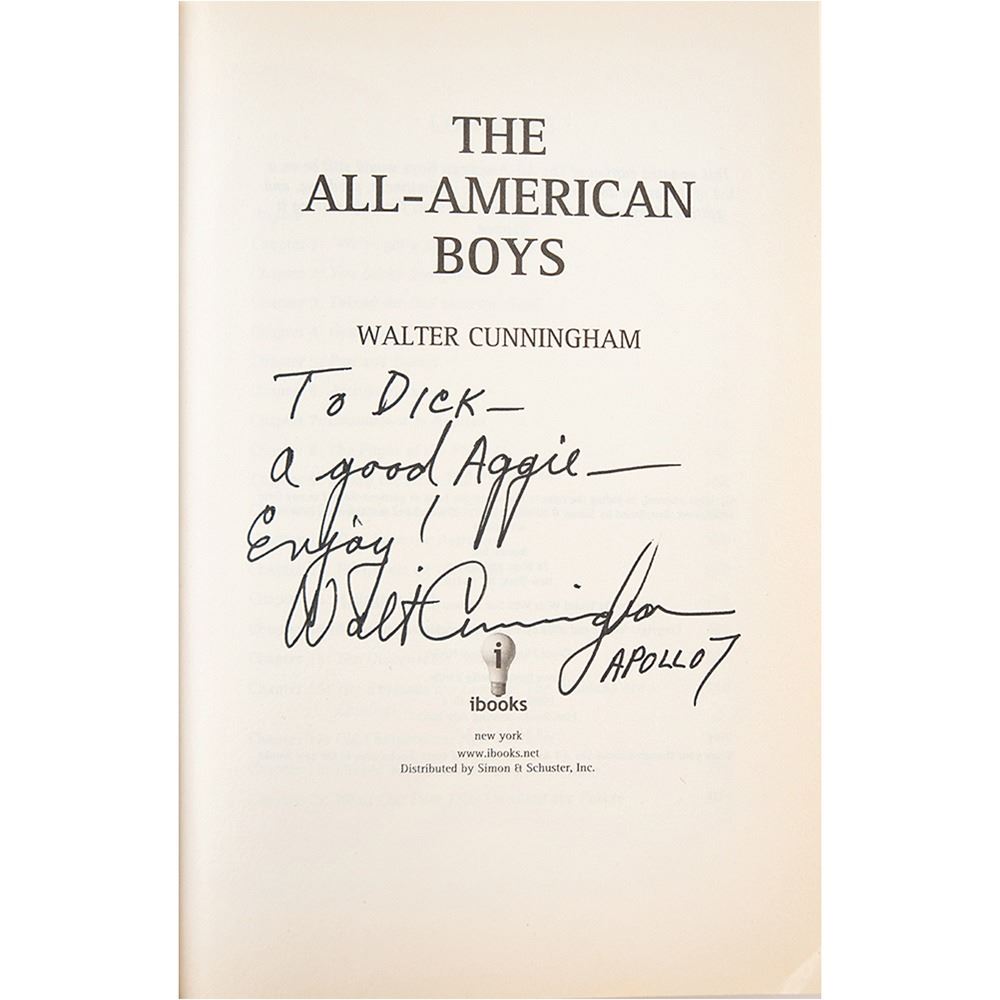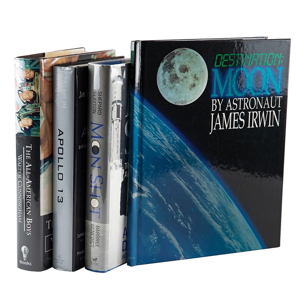 Four hardcover books signed on an opening page by an Apollo astronaut, including: Walt Cunningham (The All-American Boys, ins), James Irwin (Destination: Moon, ins), James Lovell (Apollo 13), and Alan Shepard (Moon Shot). In overall fine condition.