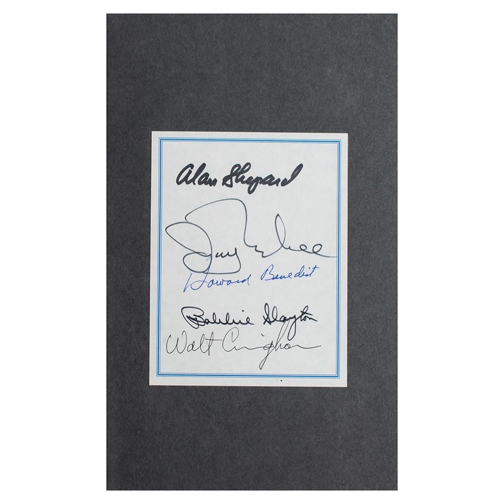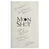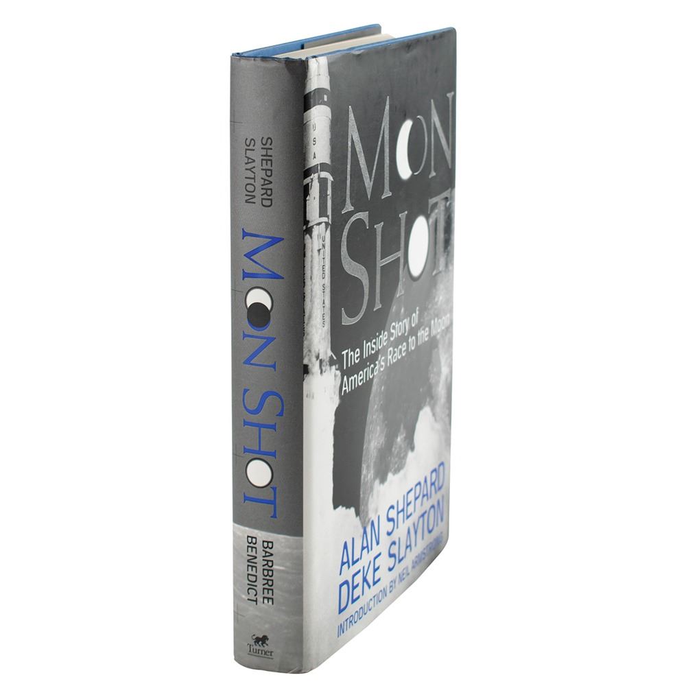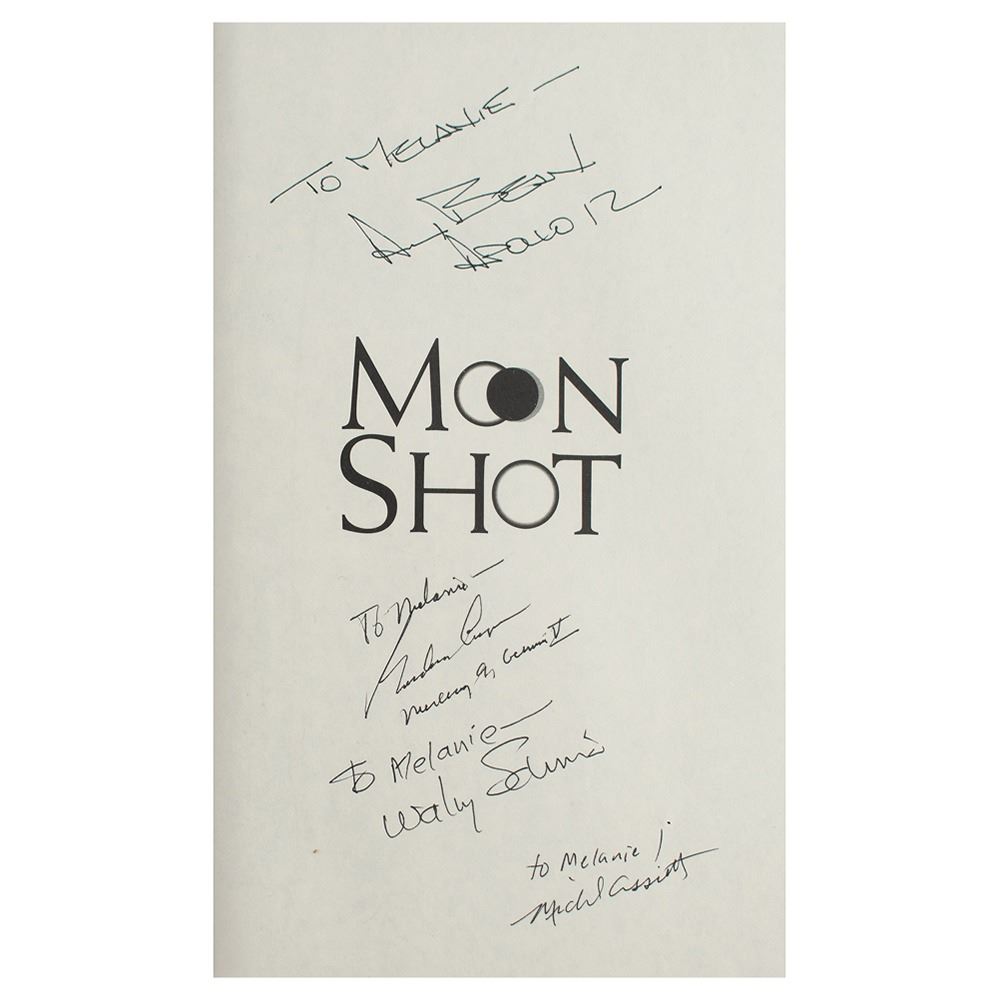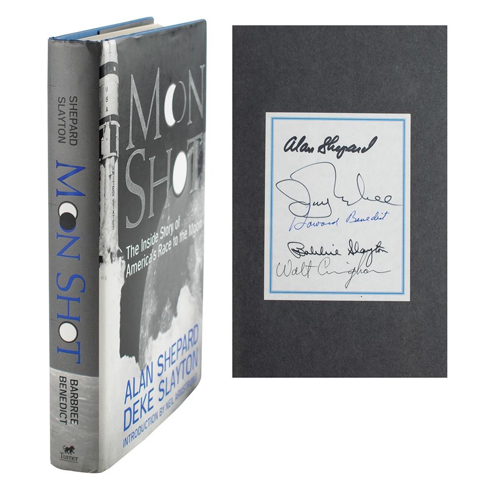Signed book: Moon Shot. Later printing. Atlanta, GA: Turner Publishing, 1994. Hardcover with dust jacket, 6.5 x 9.25, 383 pages. Signed on a bookplate affixed to the first free end page in felt tip by Alan Shepard and Walt Cunningham (along with Deke Slayton's wife, Bobbie Slayton, and co-authors Jay Barbree and Howard Benedict), and signed and inscribed on the half-title page by Alan Bean, Gordon Cooper, Wally Schirra, and one other, all adding dedications to "Melanie." In fine condition, with bumped corners.