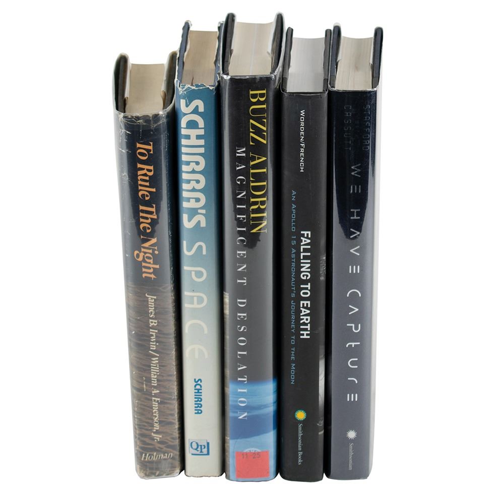 Five books signed by Apollo astronauts, all hardcovers with dust jackets, including: Buzz Aldrin (Magnificent Desolation); Al Worden (Falling to Earth, inscribed by Worden and also signed by co-author Francis French); Jim Irwin (To Rule the Night, inscribed); Wally Schirra (Schirra's Space, inscribed); Tom Stafford (We Have Capture). In overall fine condition, with small edge tears to the Schirra dust jacket.