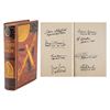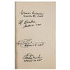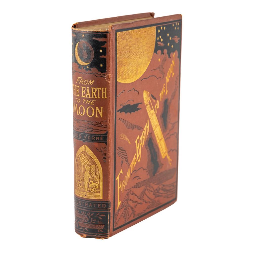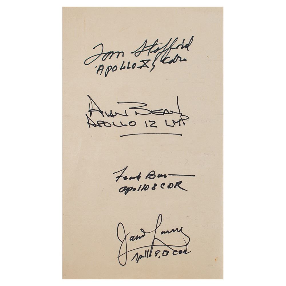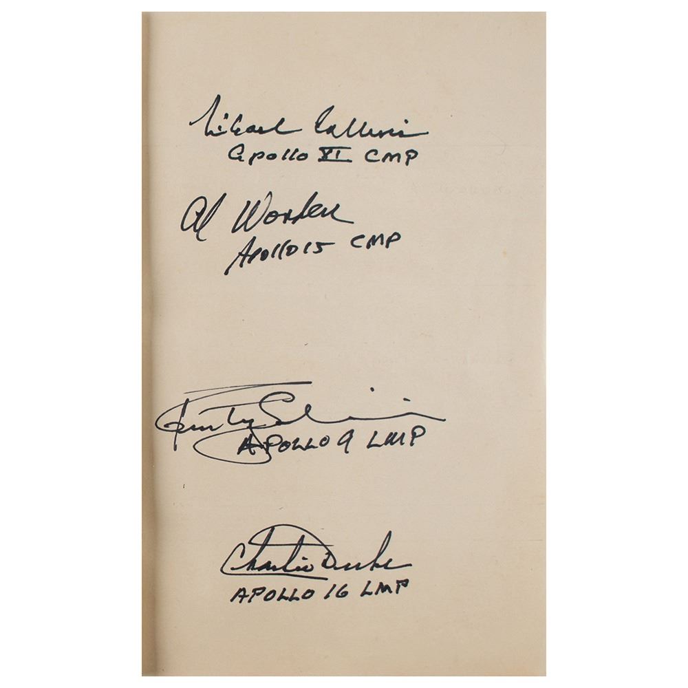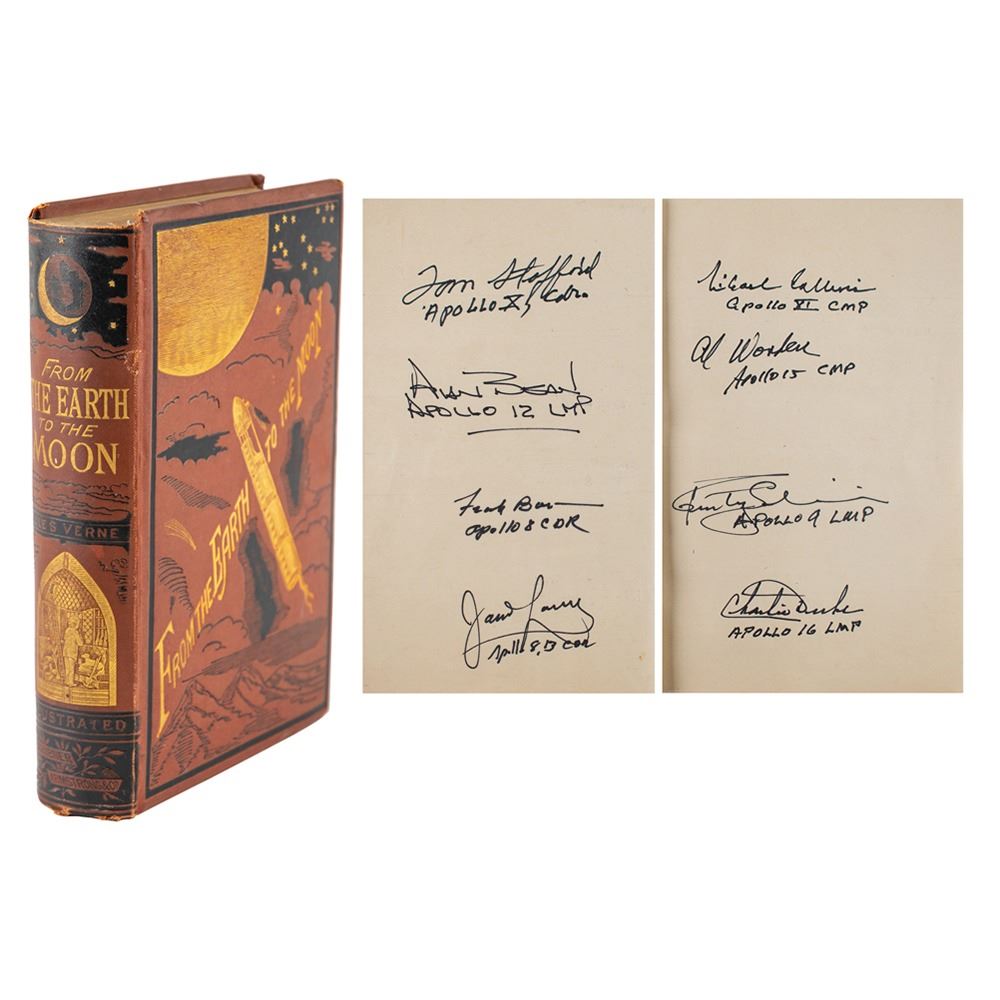 Signed book: From the Earth to the Moon by Jules Verne. New York: Scribner, Armstrong & Company, 1874. Hardcover, 5.75 x 8, 323 pages. Signed on professionally tipped-in adjacent opening pages in bold black ink by eight Apollo astronauts: "Tom Stafford, Apollo X, Cdr.,†“Alan Bean, Apollo 12 LMP,†“Frank Borman, Apollo 8 CDR,†“James Lovell, Apollo 8, 13 CDR,†“Michael Collins, Apollo XI CMP,†“Al Worden, Apollo 15 CMP,†“Rusty Schweickart, Apollo 9 LMP,†and “Charlie Duke, Apollo 16 LMP.†Autographic condition: fine. Book condition: VG/None, with edgewear, a previous owner's bookplate affixed to front pastedown (and ownership signature to first free end page), and restoration to front hinge.