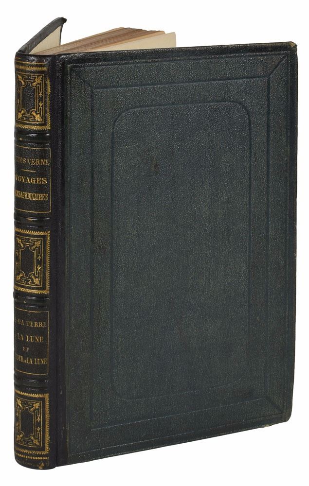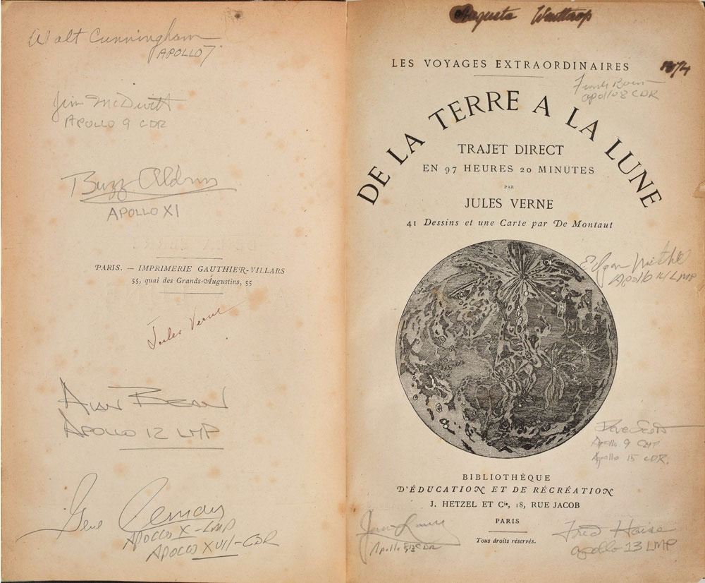 Signed book: De la Terre a la Lune, trajet direct en 97 heures 20 minutes. Paris: J. Hetzel, Bibliotheque D'education et de Recreation. French language, hardcover with clamshell, 8.25 x 11.75, 180 pages. Signed on the title page and the adjacent page in pencil by an astounding 10 Apollo astronauts, including: "Walt Cunningham, Apollo 7," "Jim McDivitt, Apollo 9 CDR," "Buzz Aldrin, Apollo XI," "Alan Bean, Apollo 12 LMP," "Gene Cernan, Apollo X–LMP, Apollo XVII–CDR," "Frank Borman, Apollo 8 CDR," "Edgar Mitchell, Apollo 14 LMP," "Dave Scott, Apollo 9 CMP, Apollo 15 CDR," "James Lovell, Apollo 8, 13 CDR," and "Fred Haise, Apollo 13 LMP." In very good condition, with foxing, toning and edge chipping; the "Jules Verne" above Bean's signature is in an unknown hand. Accompanied by a full letter of authenticity from Zarelli Space Authentication. A wonderful offering signed by Apollo astronauts who helped turn the science fiction of Jules Verne into modern-day reality.
