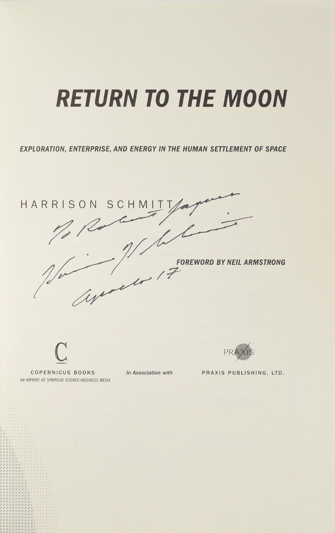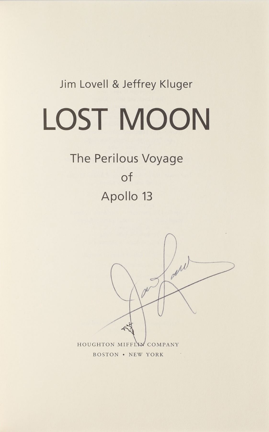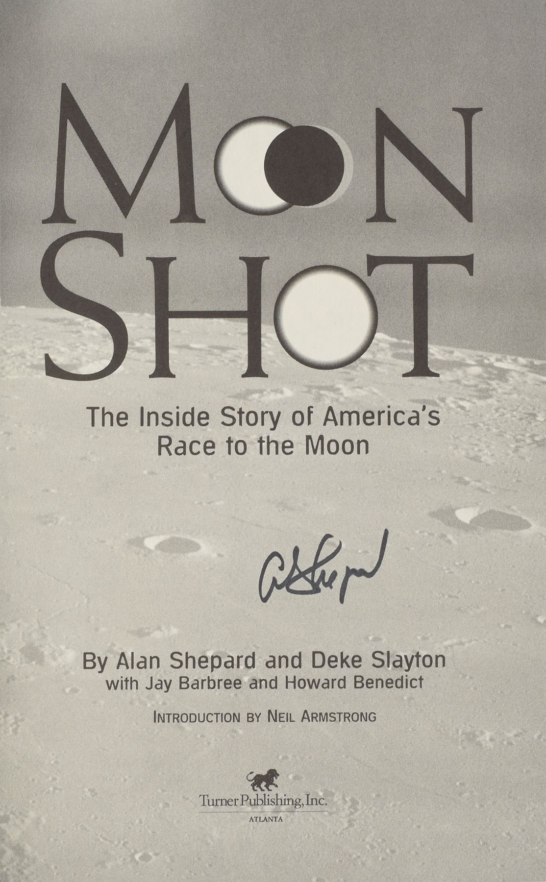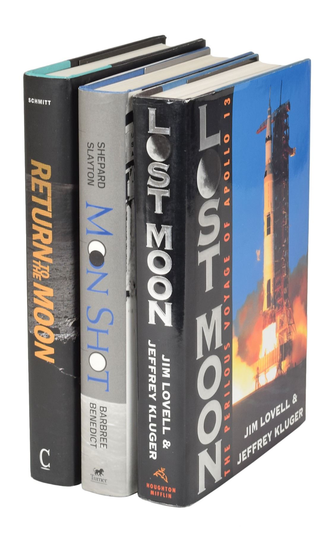 Group of three signed books, all hardcovers with dust jackets, each signed inside by an Apollo astronaut: Moon Shot, signed on the title page in black felt tip by Alan Shepard, "A. Shepard"; Lost Moon, signed on the title page in black ballpoint by James Lovell, "James Lovell"; and Return to the Moon, signed and inscribed on the title page in black felt tip by Harrison Schmitt, "To Robert Jaques, Harrison H. Schmitt, Apollo 17." In overall fine condition, with a small piece of tape affixed to the front of the Moon Shot dust jacket, which is also price-clipped.