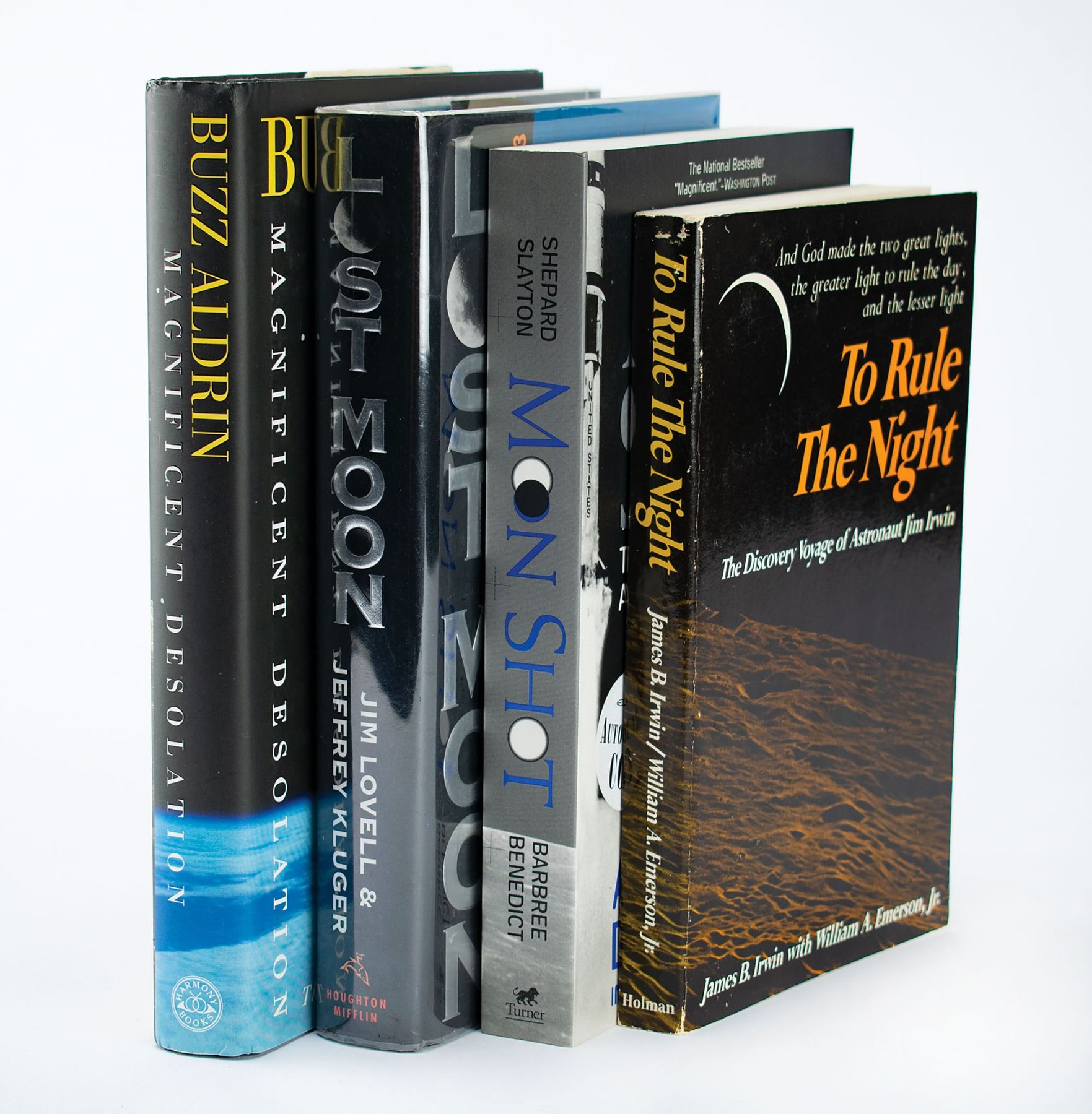 Four books signed by Apollo astronauts: a hardcover edition of Magnificent Desolation, signed on the half-title page in black felt tip by Buzz Aldrin; a hardcover edition of Lost Moon, signed on the title page in black felt tip by Jim Lovell; a softcover edition of To Rule The Night, signed and inscribed on the half-title page in black felt tip by Jim Irwin; and a softcover edition of Moon Shot, signed on the title page in black felt tip by Alan Shepard. In overall fine condition.