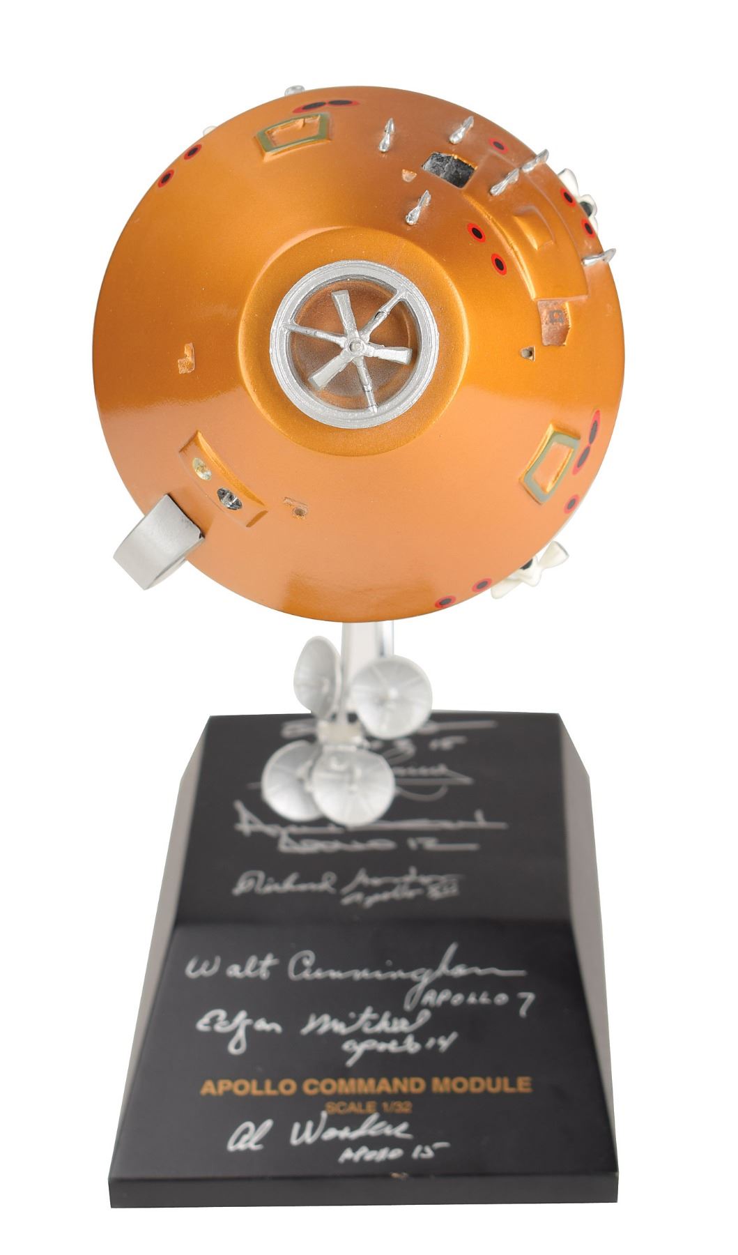 Sought-after 1:32 solid mahogany scale model of an Apollo Command Module by the Toys and Models Corporation, measuring 12.75? in length and suspended atop a solid wood base at a height of 12?. The base, which measures 5.25? x 8.25?, is signed in silver ink by seven Apollo astronauts, including three moonwalkers and four CMPs: "Dave Scott, Apollo 9, 15," "James Lovell, Apollo 13," "Alan Bean, Apollo 12," "Richard Gordon, Apollo XII," "Walt Cunningham, Apollo 7," "Edgar Mitchell, Apollo 14," and "Al Worden, Apollo 15." In fine condition.
