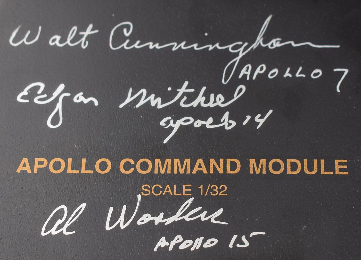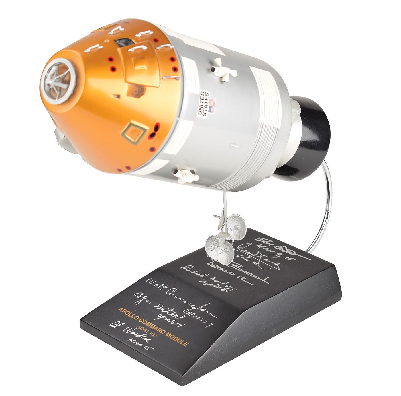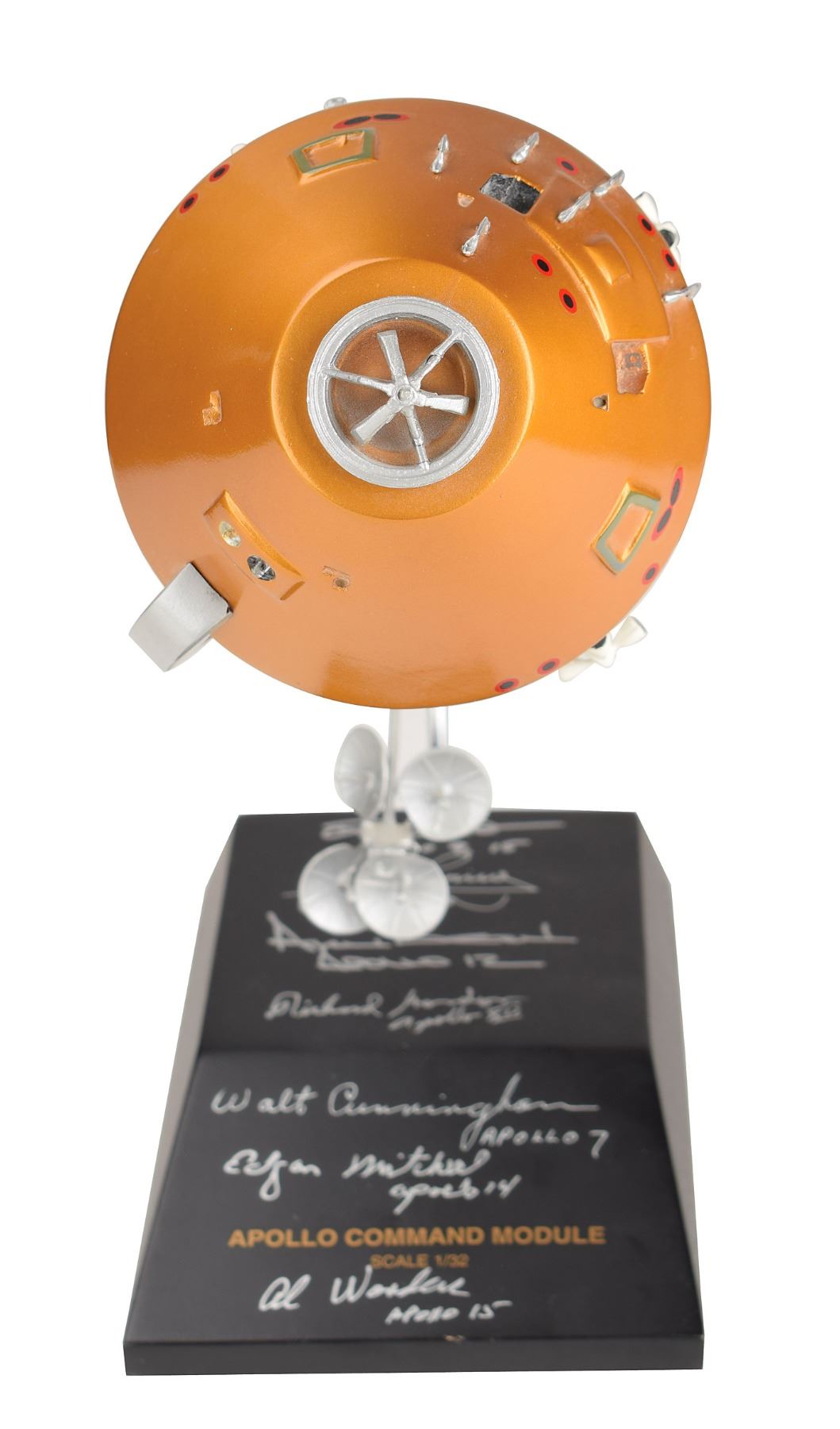 Sought-after 1:32 solid mahogany scale model of an Apollo Command Module by the Toys and Models Corporation, measuring 12.75˝ in length and suspended atop a solid wood base at a height of 12˝. The base, which measures 5.25˝ x 8.25˝, is signed in silver ink by seven Apollo astronauts, including three moonwalkers and four CMPs: "Dave Scott, Apollo 9, 15," "James Lovell, Apollo 13," "Alan Bean, Apollo 12," "Richard Gordon, Apollo XII," "Walt Cunningham, Apollo 7," "Edgar Mitchell, Apollo 14," and "Al Worden, Apollo 15." In fine condition.