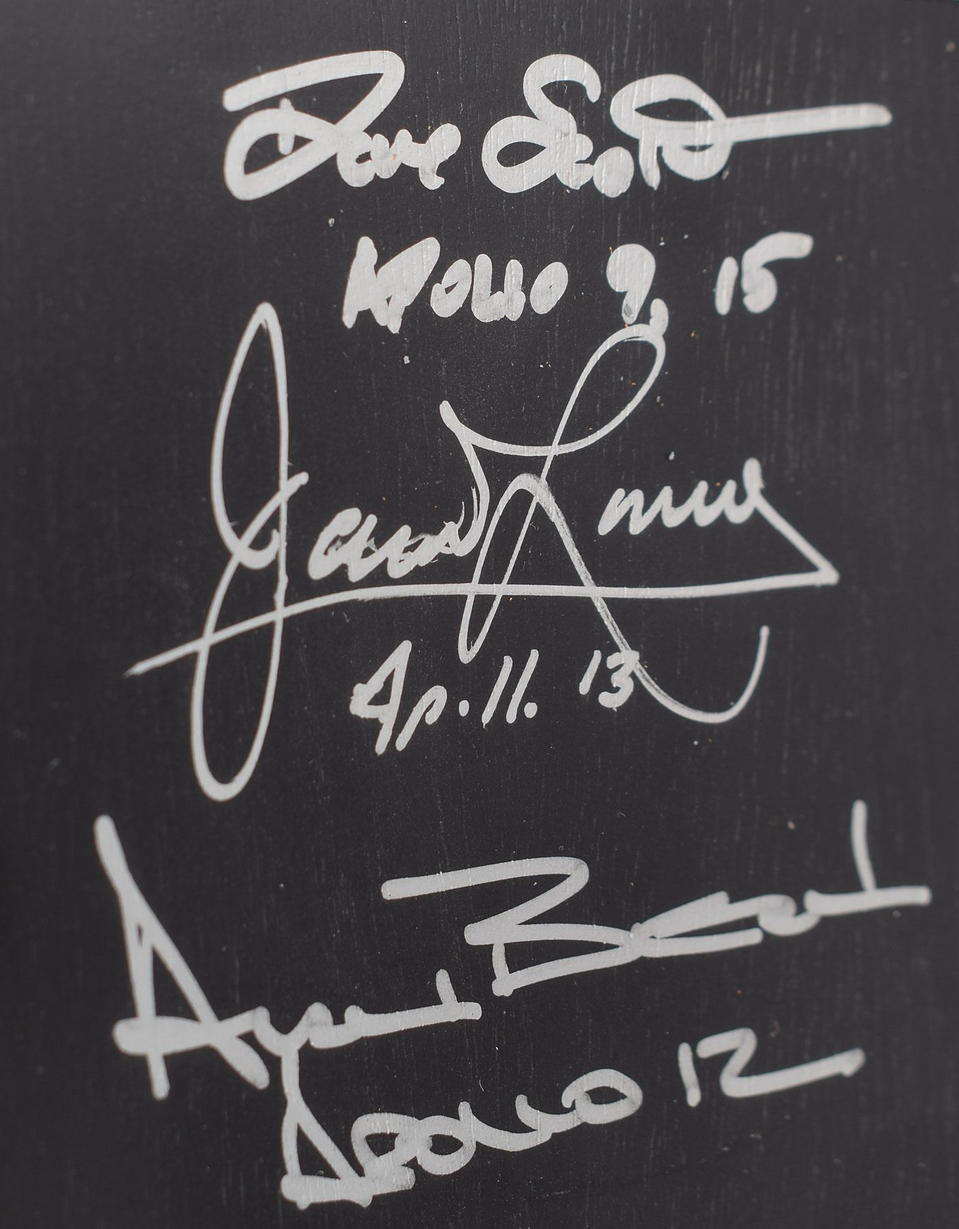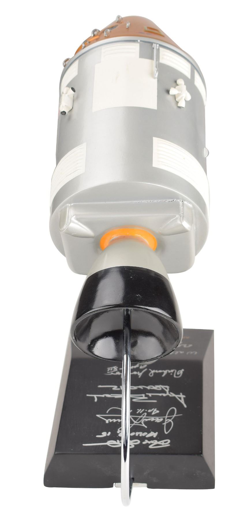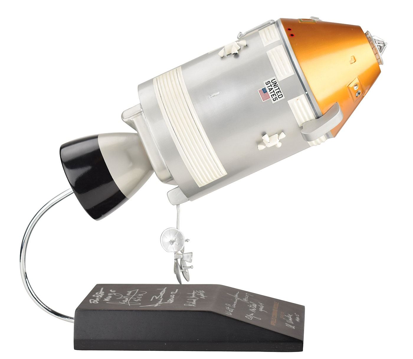 Sought-after 1:32 solid mahogany scale model of an Apollo Command Module by the Toys and Models Corporation, measuring 12.75˝ in length and suspended atop a solid wood base at a height of 12˝. The base, which measures 5.25˝ x 8.25˝, is signed in silver ink by seven Apollo astronauts, including three moonwalkers and four CMPs: "Dave Scott, Apollo 9, 15," "James Lovell, Apollo 13," "Alan Bean, Apollo 12," "Richard Gordon, Apollo XII," "Walt Cunningham, Apollo 7," "Edgar Mitchell, Apollo 14," and "Al Worden, Apollo 15." In fine condition.