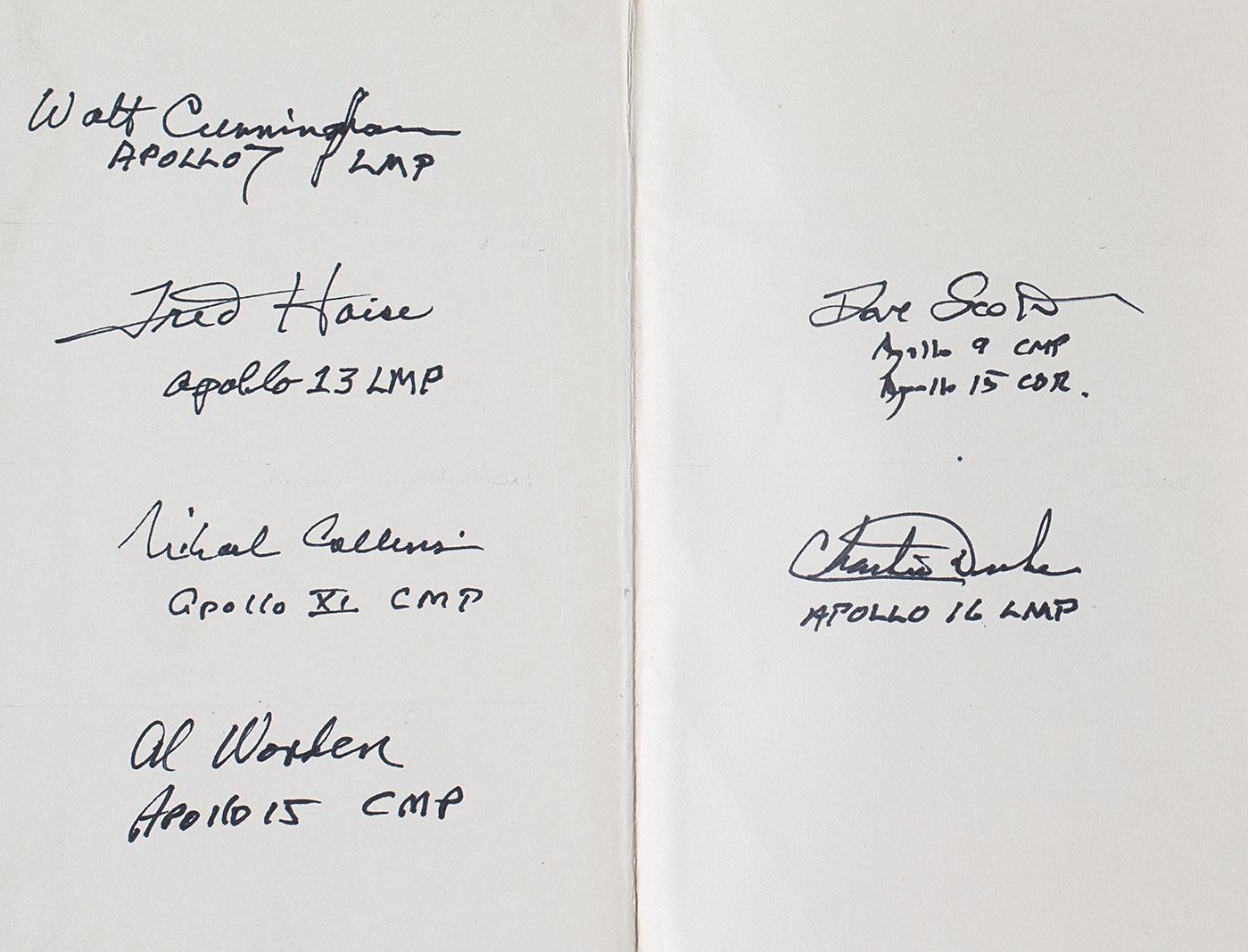 Signed book: From the Earth to the Moon by Jules Verne. Eleventh edition. London: Sampson Low, Marston & Company. Hardcover, 5.25 x 7.25, 323 pages. Signed on neatly tipped-in endpapers in black felt tip by six Apollo astronauts, "Walt Cunningham, Apollo 7 LMP," "Fred Haise, Apollo 13 LMP," "Michael Collins, Apollo XI CMP," "Al Worden, Apollo 15 CMP," "Dave Scott, Apollo 9 CMP, Apollo 15 CDR," and "Charlie Duke, Apollo 16 LMP." Autographic condition fine. Book: VG+/None, with bumps to spine ends and mild edgewear. Interestingly, there were several similarities between Verne’s novel and the eventuality of the Apollo program, including: the US being the first to launch a manned spacecraft to circumnavigate the moon; the rejection of Brownsville, Texas as a launch site, and the subsequent choosing of Florida; Apollo 8 being launched in the month of December and splash down and recovery in the Pacific; and the crews being made up of three members. A seldom-seen and highly desirable format connecting science fiction dreams to space age realities.