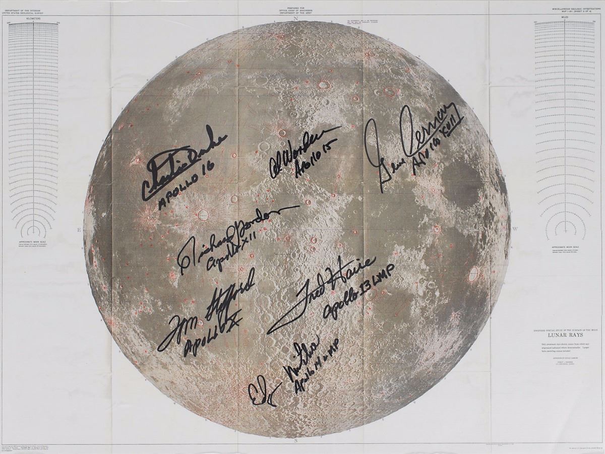 Appealing color 15.75 x 12 geologic investigations map of the moon, entitled “Engineer Special Study of the Surface of the Moon, Lunar Rays,” prepared by the Department of the Interior United States Geological Survey, signed in black felt tip by Charlie Duke, Al Worden, Gene Cernan, Richard Gordon, Tom Stafford, Fred Haise, and Edgar Mitchell, with each adding their mission designation below. In fine condition. An uncommon, visually impressive lunar map signed by seven of NASA’s most storied astronauts.