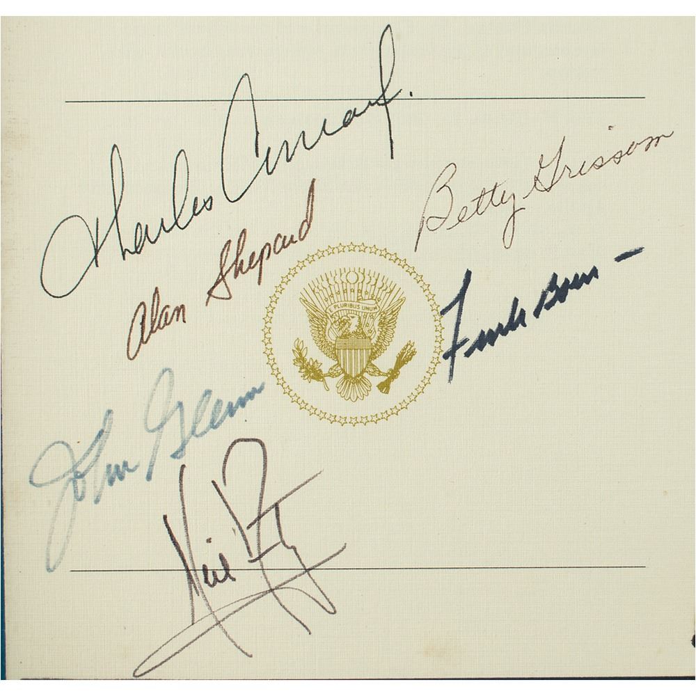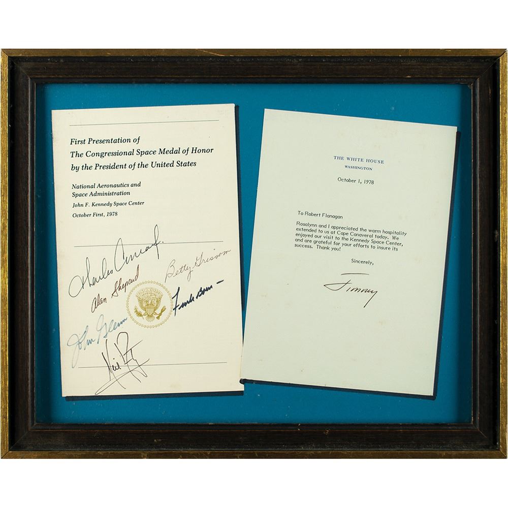 Front cover of the program for the “First Presentation of the Congressional Space Medal of Honor by the President of the United States,” held at the John F. Kennedy Space Center on October 1, 1978, signed in black ink and felt tip by Neil Armstrong, Alan Shepard, Charles Conrad, John Glenn, Frank Borman, and Betty Grissom. Accompanying the program cover is a TLS from President Jimmy Carter signed “Jimmy,” one page, 6 x 8.5, White House letterhead, October 1, 1978, addressed to Robert Flanagan, in full: “Rosalynn and I appreciated the warm hospitality extended to us at Cape Canaveral today. We enjoyed our visit to the Kennedy Space Center, and are grateful for your efforts to insure its success. Thank you!” Both are mounted and framed to an overall size of 15.75 x 12.75. In overall fine condition. An uncommon and very desirable union of moonwalkers and an American president, whom space historian John Logsdon noted 'was perhaps the least supportive of U.S. human space efforts of any president in the last half-century.'