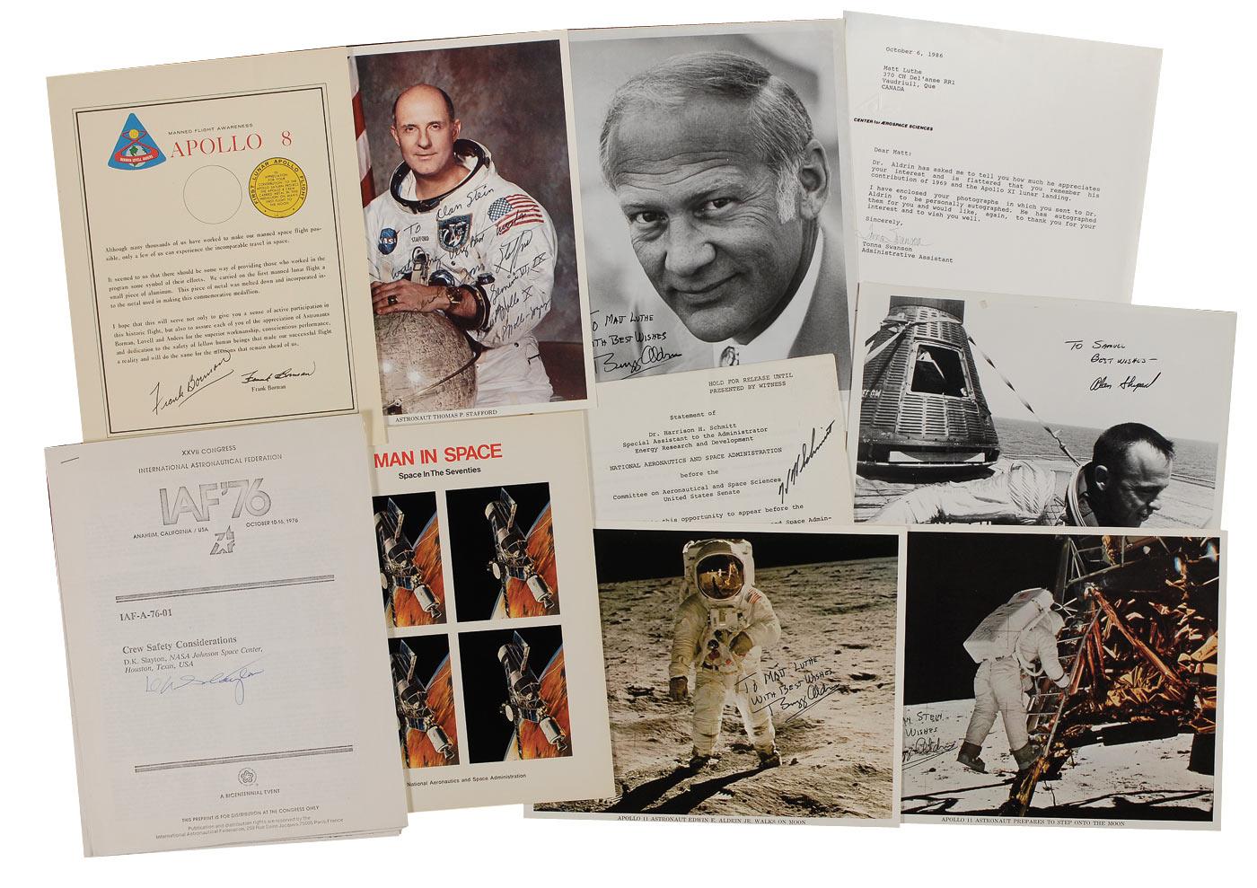 Eleven items: three color NASA photos, two 8 x 10 photos of Aldrin on the moon, signed and inscribed in black felt tip, and one 10 x 8, signed and inscribed in black felt tip by Tom Stafford; two glossy photos, one 8 x 10 of Buzz Aldrin and one 10 x 8 of Alan Shepard, both signed and inscribed in black ink; one Man in Space-Space in the Seventies illustrated booklet, signed on the title page in black ballpoint, “Best Wishes, Rusty Schweickart”; a certificate of authenticity signed in black felt tip by Frank Borman; two sets of documents signed on the front covers, one in blue ballpoint and one in black felt tip, by Deke Slayton; and a NASA statement signed on the front cover in black felt tip by Harrison Schmitt. In overall fine condition, with light corner creasing to all items, and mild surface marks to the facial area of Buzz Aldrin’s glossy photo. Accompanied by a letter of provenance from Buzz Aldrin’s assistant.