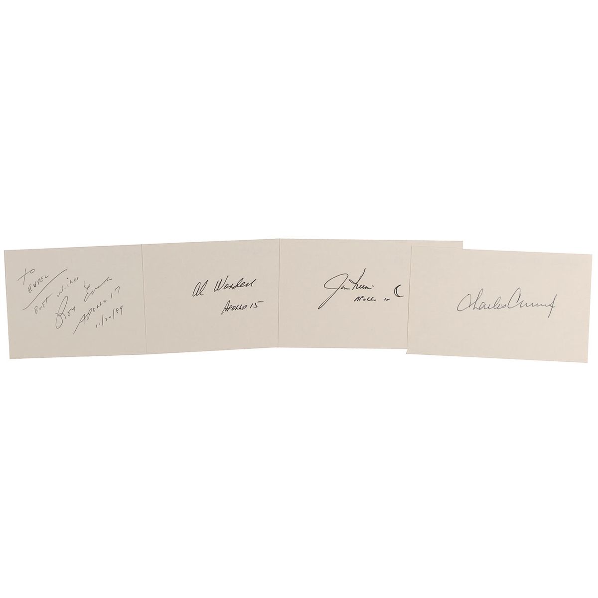Ink signatures, “Charles Conrad,” “Jim Irwin, Apollo 15,” “Al Worden, Apollo 15,” and “To Rupel, Best wishes, Ron Evans, Apollo 17 11/20/89,” on individual off-white 5 x 3 cards. In fine condition.