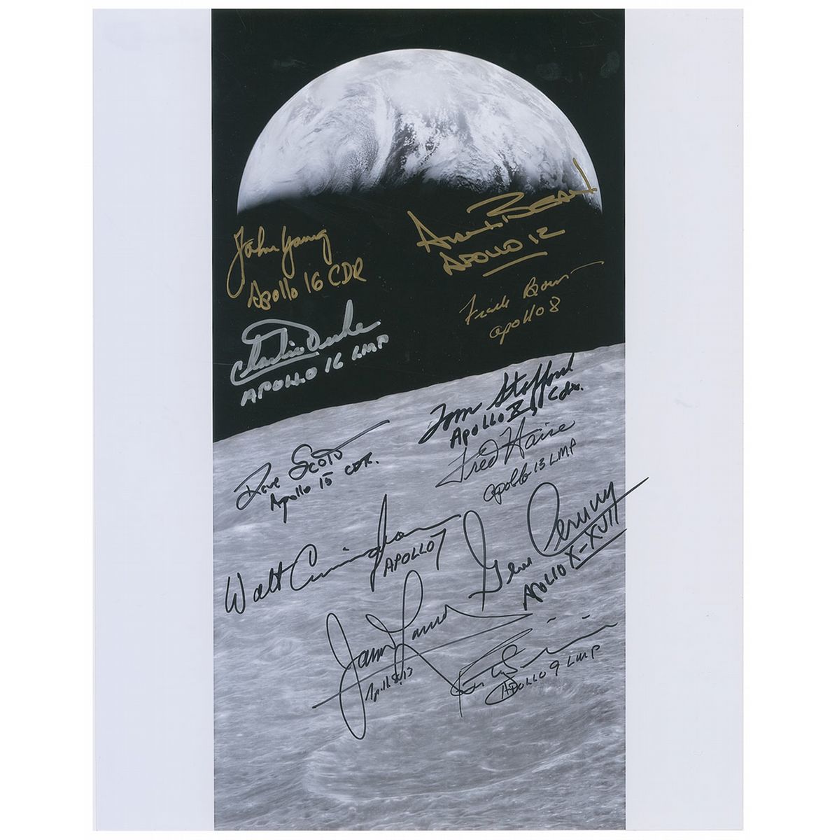 Visually stunning color satin-finish 11 x 14 photo of the Earth over the horizon of the lunar surface, signed in gold ink, “John Young, Apollo 16 CDR,” “Alan Bean, Apollo 12,” and “Frank Borman, Apollo 8,” in silver ink, “Charlie Duke, Apollo 16 LMP,” and in black felt tip, “Dave Scott, Apollo 15 CRD,” “Tom Stafford, Apollo X Cdr,” “Fred Haise, Apollo 13 LMP,” “Walt Cunningham, Apollo 7,” “Gene Cernan, Apollo X—XVII,” “James Lovell, Apollo 8, 13,” and “Rusty Schweickart, Apollo 9 LMP.” In fine condition. An impressive assemblage, including five moonwalkers, with each astronaut also adding their respective mission.