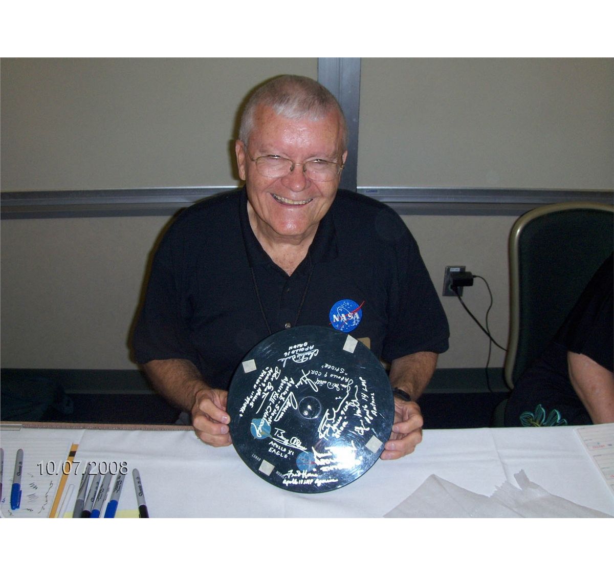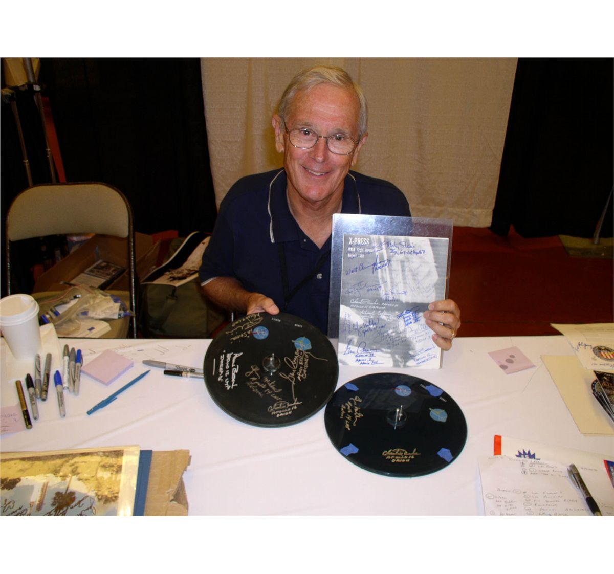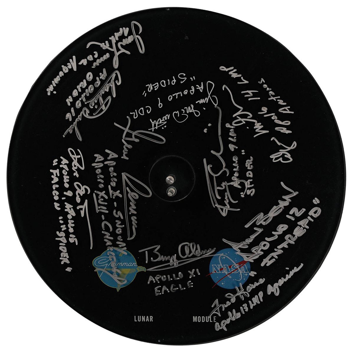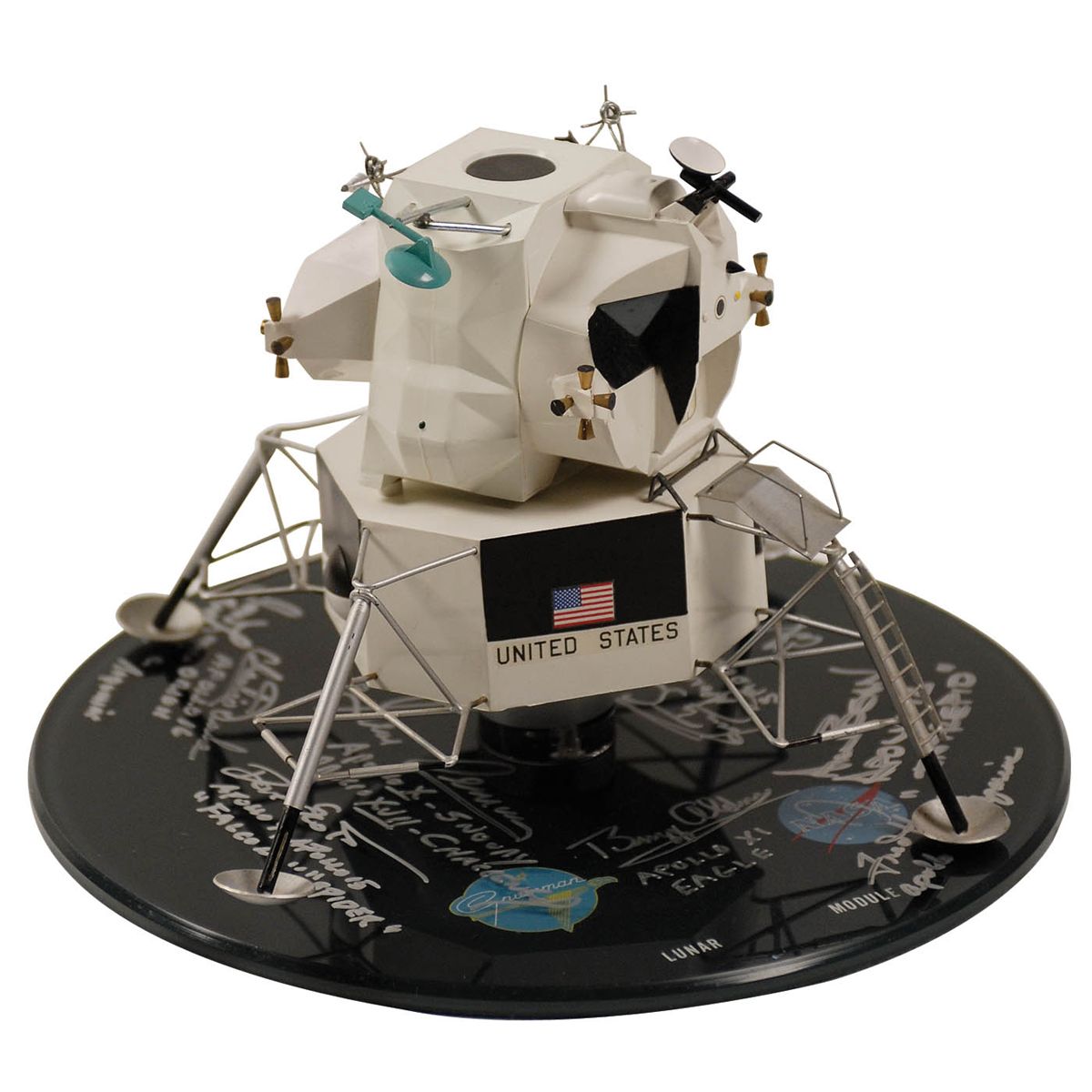 Grumman Apollo Lunar Module Contractor's model, manufactured for Grumman by Precise Models, Inc. prior to the Apollo 11 moon landing. The two-piece LM is removable from the base, made of injection-molded plastic, and is approximately 6" tall and 10" across. It accurately separates into Ascent and Descent Stages and has numerous tiny projecting parts. The 10.25" diameter black base has color logos of both Grumman and NASA with the text "Lunar Module" printed near the edge. Signed on the base in silver ink by ten Apollo astronauts. Signers are: “Gene Cernan, Apollo X–Snoopy; Apollo XVII–Challenger,” “Dave Scott Apollo 9, Apollo 15 ‘Falcon’ ‘Spider,’” “Charlie Duke, Apollo 16, Orion,” “James Lovell Apollo 13 CDR Aquarius,” “Jim McDivitt Apollo 9 CDR ‘Spider,’” “Edgar Mitchell Apollo 14 LMP Antares,” “Rusty Schweickart Apollo 9 LMP ‘Spider,’” “Alan Bean Apollo 12, Intrepid,’” “Fred Haise Apollo 13 Aquarius,” and “Buzz Aldrin Apollo XI Eagle.” In fine condition, with some scattered light surface wear to base. Model comes with its original shipping box. Accompanied by a CD of photos of the astronauts taken at time of signing and a certificate of authenticity from Novaspace for the McDivitt signature. These desirable models are often found with severe yellowing due to age and light exposure; this one is a very presentable off-white color. Missing parts are another problem often found; this model appears to be complete. A great gathering of space pioneers all paying homage to their particular modules.