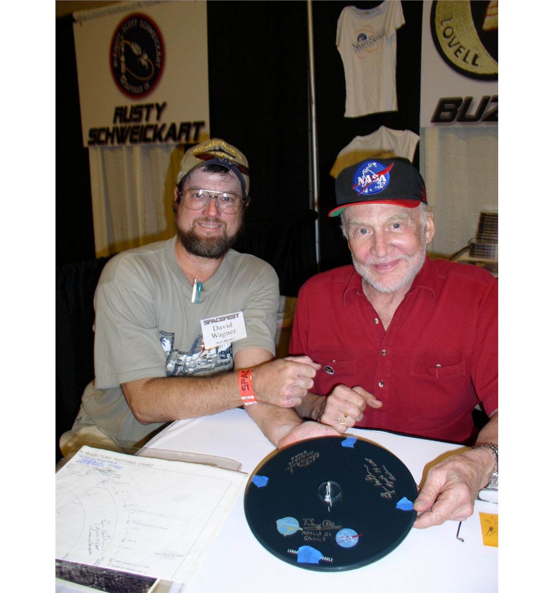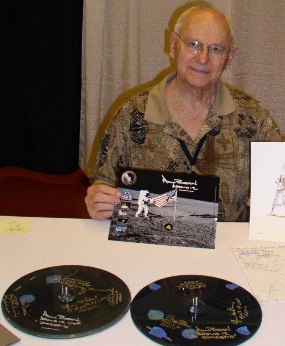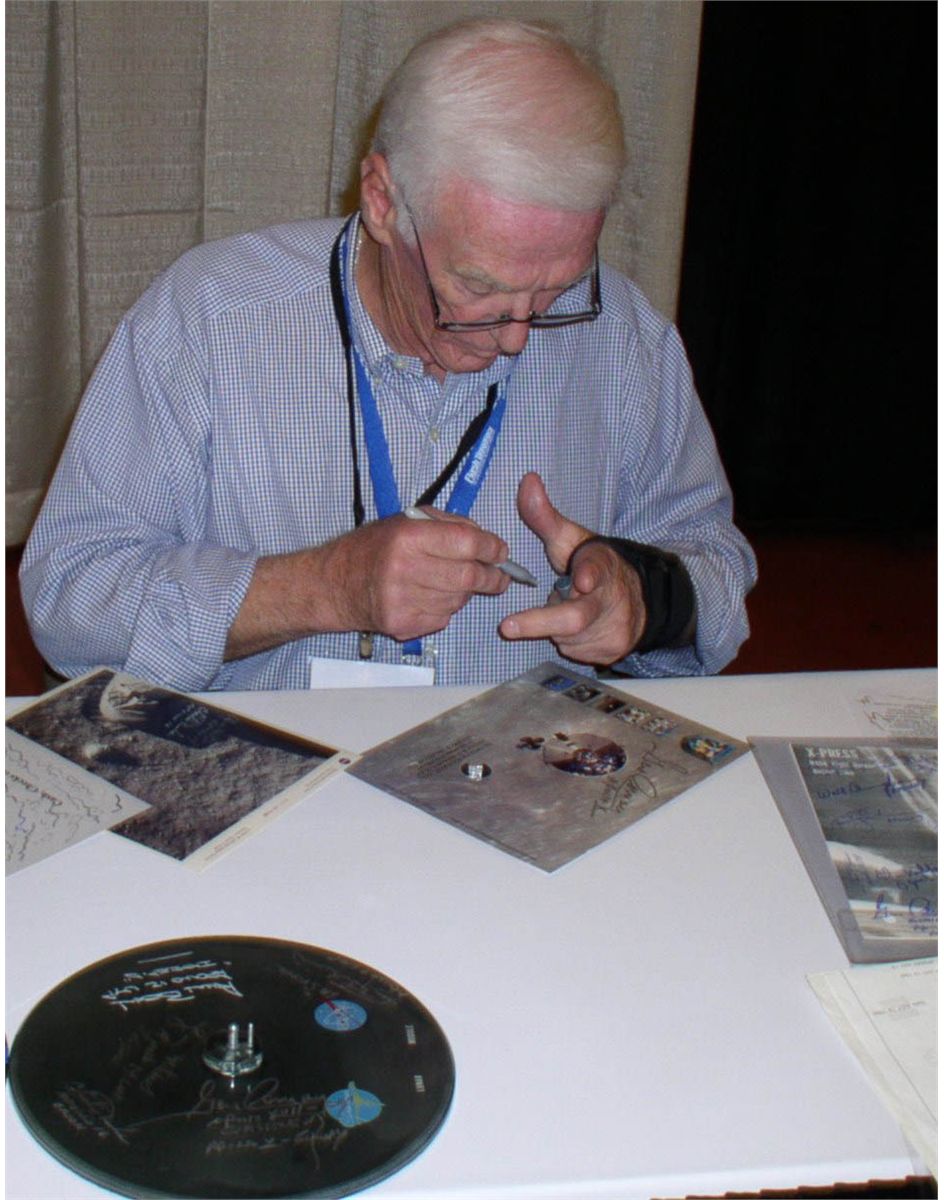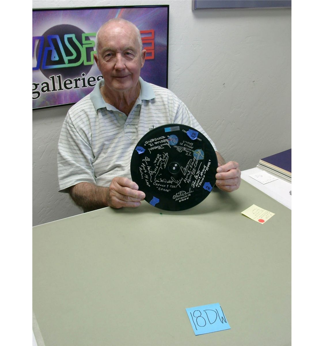 Grumman Apollo Lunar Module Contractor's model, manufactured for Grumman by Precise Models, Inc. prior to the Apollo 11 moon landing. The two-piece LM is removable from the base, made of injection-molded plastic, and is approximately 6" tall and 10" across. It accurately separates into Ascent and Descent Stages and has numerous tiny projecting parts. The 10.25" diameter black base has color logos of both Grumman and NASA with the text "Lunar Module" printed near the edge. Signed on the base in silver ink by ten Apollo astronauts. Signers are: “Gene Cernan, Apollo X–Snoopy; Apollo XVII–Challenger,” “Dave Scott Apollo 9, Apollo 15 ‘Falcon’ ‘Spider,’” “Charlie Duke, Apollo 16, Orion,” “James Lovell Apollo 13 CDR Aquarius,” “Jim McDivitt Apollo 9 CDR ‘Spider,’” “Edgar Mitchell Apollo 14 LMP Antares,” “Rusty Schweickart Apollo 9 LMP ‘Spider,’” “Alan Bean Apollo 12, Intrepid,’” “Fred Haise Apollo 13 Aquarius,” and “Buzz Aldrin Apollo XI Eagle.” In fine condition, with some scattered light surface wear to base. Model comes with its original shipping box. Accompanied by a CD of photos of the astronauts taken at time of signing and a certificate of authenticity from Novaspace for the McDivitt signature. These desirable models are often found with severe yellowing due to age and light exposure; this one is a very presentable off-white color. Missing parts are another problem often found; this model appears to be complete. A great gathering of space pioneers all paying homage to their particular modules.
