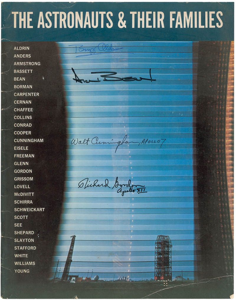 Magazine entitled “The Astronauts & Their Families,” printed in 1965 by World Book Encyclopedia Science Service, 71 pages. Signed on the front cover in black felt tip by Alan Bean, Walt Cunningham, and Richard Gordon, and in blue ballpoint by Buzz Aldrin. In fine condition, with several creases and light wear to front cover, some light creasing and foxing to inside pages, and light overall handling wear.
