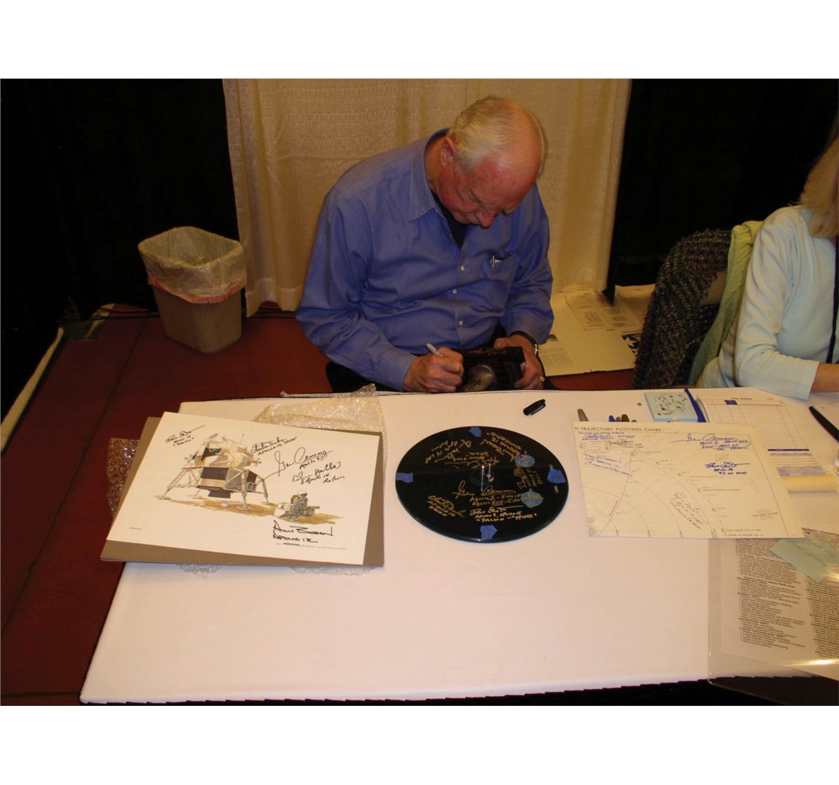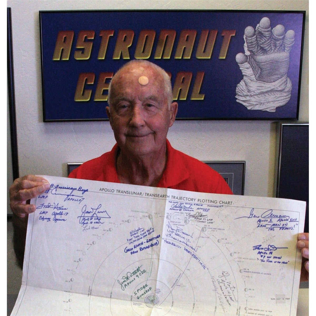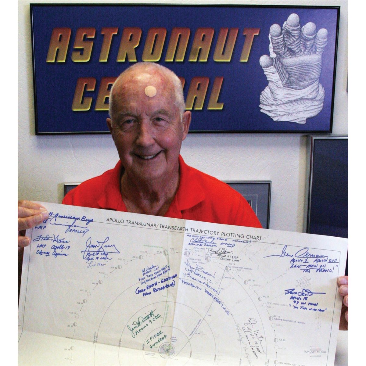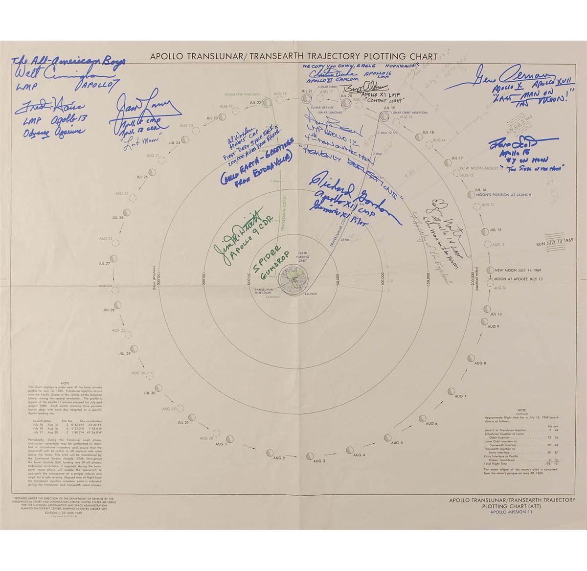 Apollo 11 Translunar/Transearth Trajectory Plotting chart, 23.75 x 20, dated June 23, 1969, originally from the Trimble estate, with pencil notations from the Apollo 11 mission, signed in various color felt tip by 12 Apollo astronauts. Signers are: “The All-American Boys, Walt Cunningham, LMP Apollo 7”; “Fred Hasie, LMP Apollo 13 Odyssey Aquarius”; “James Lovell, Apollo 8 CMD, Apollo 13 Cdr ‘Lost Moon’”; “Al Worden, Apollo 15 CMP, First deep space walk 200,000 miles from Earth (Hello Earth—Greetings from Endeavour)”; “Jim McDivitt, Apollo 9 CDR, Spider, Gumdrop”; “We copy you down Eagle, Charlie Duke, Apollo XI Capcom, Apollo 16 LMP, Moonwalker”; “Buzz Aldrin, Apollo XI LMP ‘Contact Light’”; “Alan Bean, LMP Apollo 12 4th man on the Moon, ‘Heavenly Reflections’”; “Richard Gordon Apollo XII CMP, Gemini XI Pilot”; “Gene Cernan, Apollo X, Apollo XVII ‘Last man on the Moon’”; “Dave Scott Apollo 15 #7 on Moon ‘Two sides of the moon’”; and “Edgar Mitchell Apollo 14 LMP 6th man on the moon, ‘The Way of the Explorer.’” In fine condition, with central horizontal and vertical fold and scattered light creases and wrinkles. Accompanied by a CD with photos taken at time of signing. A great collection of astronauts, all of whom have added extra notations regarding their missions. This chart is from the George Trimble Estate and has pencil notations made during the Apollo 11 flight.