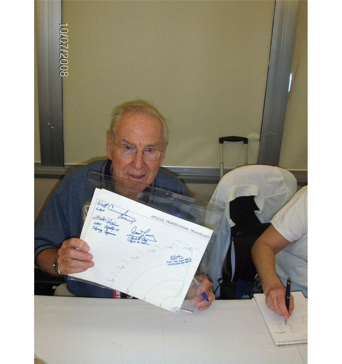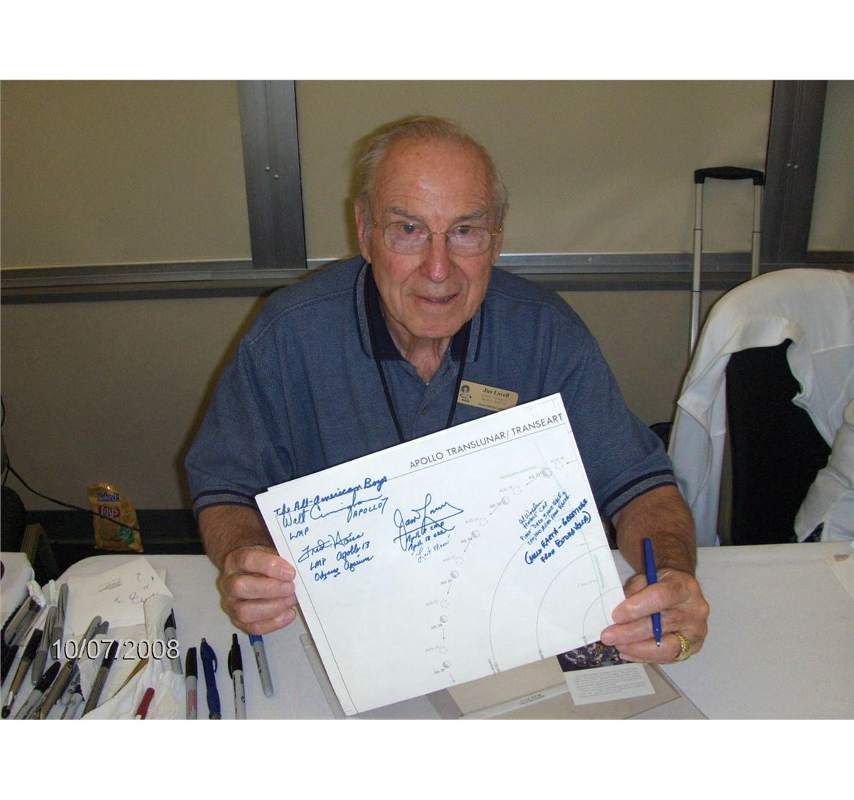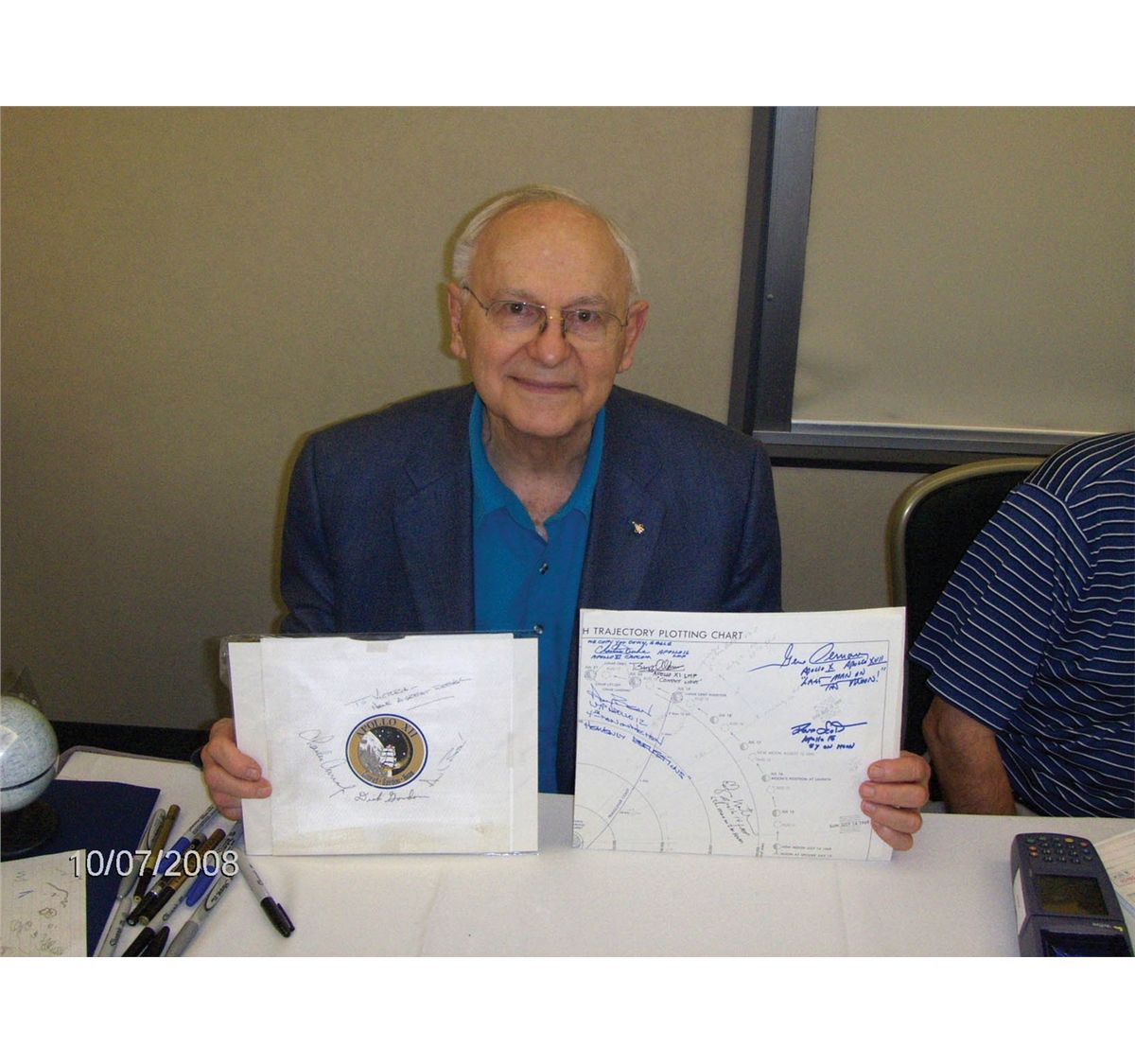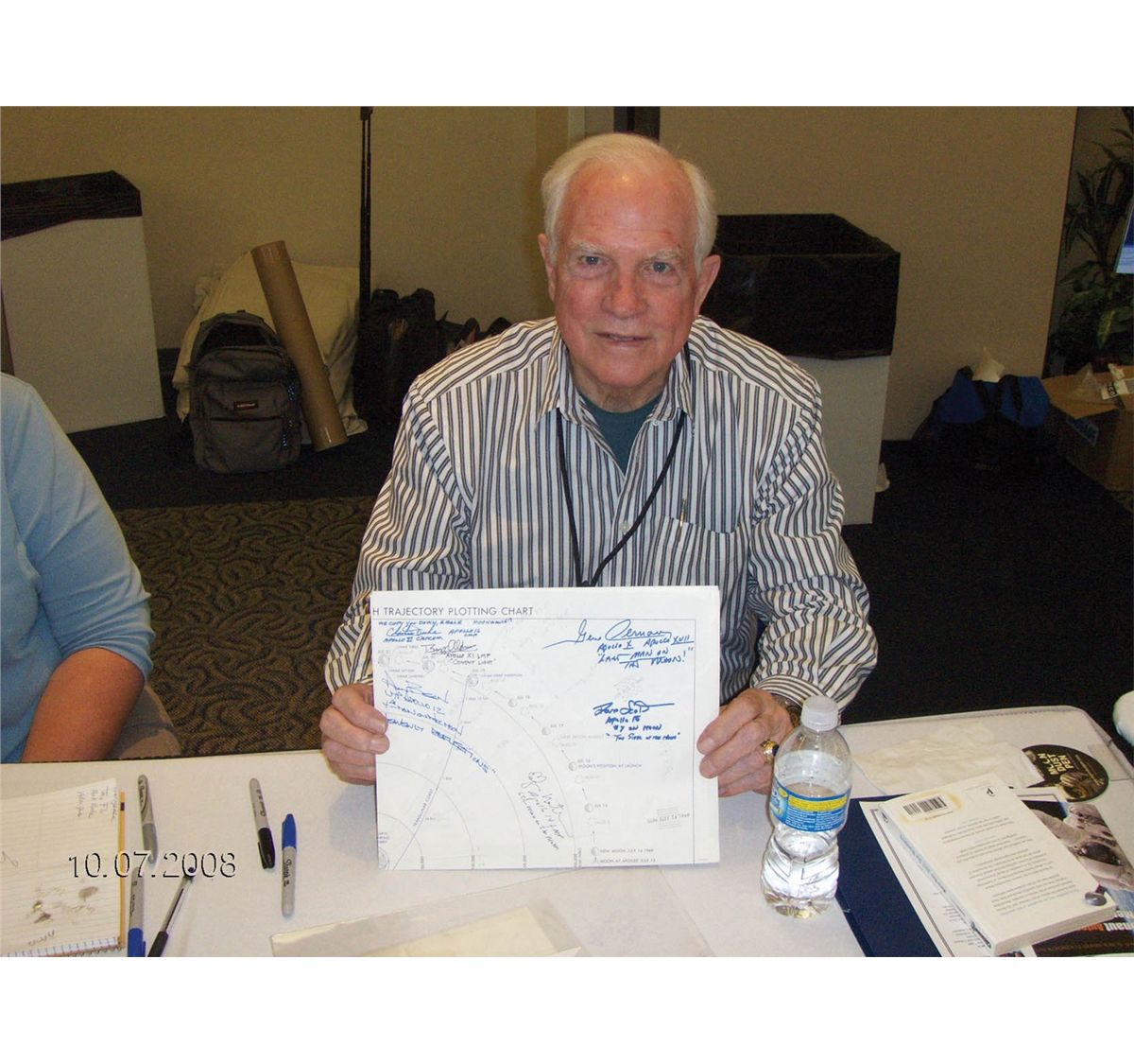 Apollo 11 Translunar/Transearth Trajectory Plotting chart, 23.75 x 20, dated June 23, 1969, originally from the Trimble estate, with pencil notations from the Apollo 11 mission, signed in various color felt tip by 12 Apollo astronauts. Signers are: “The All-American Boys, Walt Cunningham, LMP Apollo 7”; “Fred Hasie, LMP Apollo 13 Odyssey Aquarius”; “James Lovell, Apollo 8 CMD, Apollo 13 Cdr ‘Lost Moon’”; “Al Worden, Apollo 15 CMP, First deep space walk 200,000 miles from Earth (Hello Earth—Greetings from Endeavour)”; “Jim McDivitt, Apollo 9 CDR, Spider, Gumdrop”; “We copy you down Eagle, Charlie Duke, Apollo XI Capcom, Apollo 16 LMP, Moonwalker”; “Buzz Aldrin, Apollo XI LMP ‘Contact Light’”; “Alan Bean, LMP Apollo 12 4th man on the Moon, ‘Heavenly Reflections’”; “Richard Gordon Apollo XII CMP, Gemini XI Pilot”; “Gene Cernan, Apollo X, Apollo XVII ‘Last man on the Moon’”; “Dave Scott Apollo 15 #7 on Moon ‘Two sides of the moon’”; and “Edgar Mitchell Apollo 14 LMP 6th man on the moon, ‘The Way of the Explorer.’” In fine condition, with central horizontal and vertical fold and scattered light creases and wrinkles. Accompanied by a CD with photos taken at time of signing. A great collection of astronauts, all of whom have added extra notations regarding their missions. This chart is from the George Trimble Estate and has pencil notations made during the Apollo 11 flight.