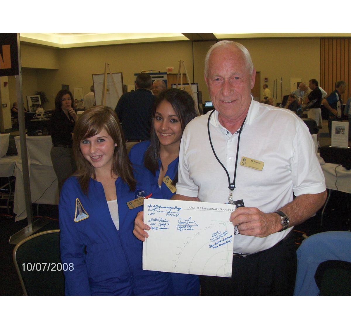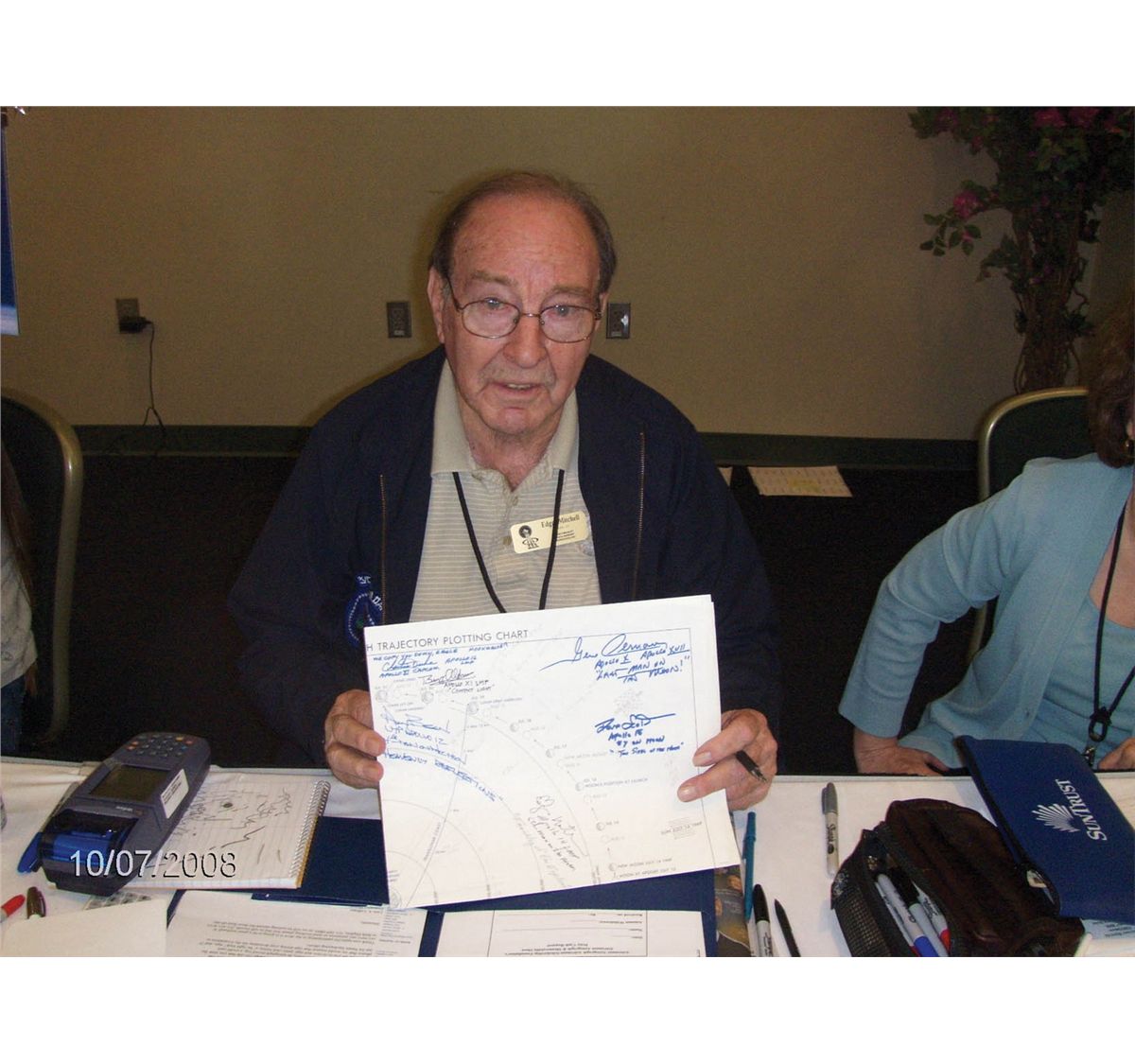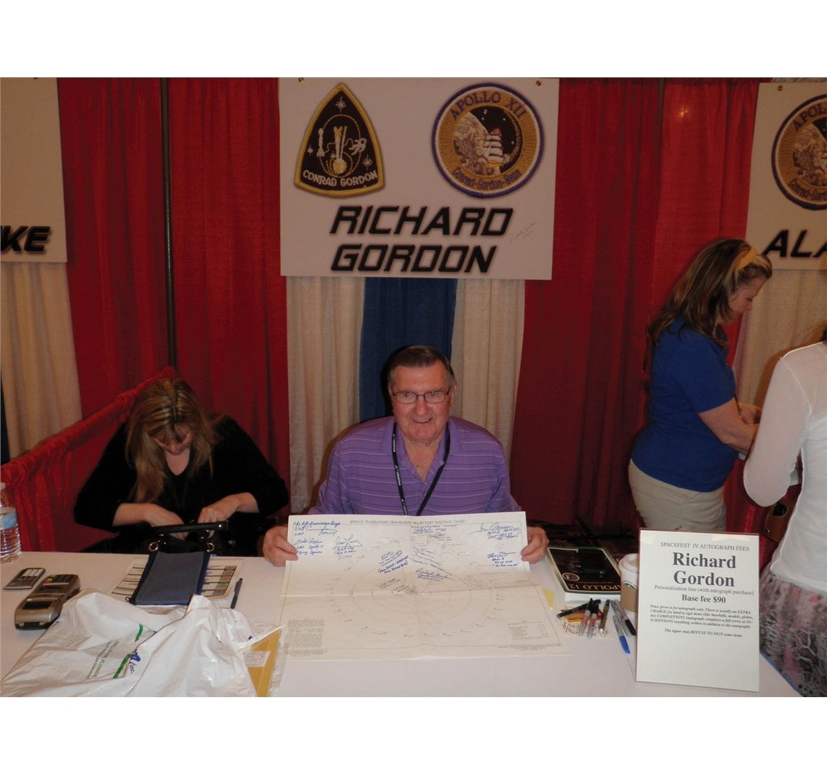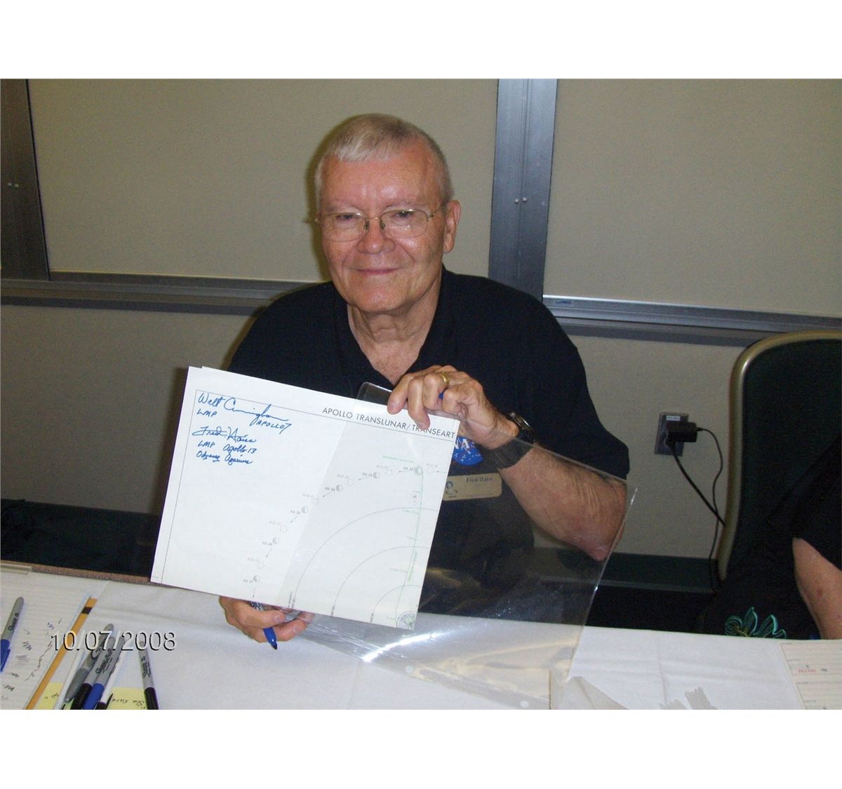 Apollo 11 Translunar/Transearth Trajectory Plotting chart, 23.75 x 20, dated June 23, 1969, originally from the Trimble estate, with pencil notations from the Apollo 11 mission, signed in various color felt tip by 12 Apollo astronauts. Signers are: “The All-American Boys, Walt Cunningham, LMP Apollo 7”; “Fred Hasie, LMP Apollo 13 Odyssey Aquarius”; “James Lovell, Apollo 8 CMD, Apollo 13 Cdr ‘Lost Moon’”; “Al Worden, Apollo 15 CMP, First deep space walk 200,000 miles from Earth (Hello Earth—Greetings from Endeavour)”; “Jim McDivitt, Apollo 9 CDR, Spider, Gumdrop”; “We copy you down Eagle, Charlie Duke, Apollo XI Capcom, Apollo 16 LMP, Moonwalker”; “Buzz Aldrin, Apollo XI LMP ‘Contact Light’”; “Alan Bean, LMP Apollo 12 4th man on the Moon, ‘Heavenly Reflections’”; “Richard Gordon Apollo XII CMP, Gemini XI Pilot”; “Gene Cernan, Apollo X, Apollo XVII ‘Last man on the Moon’”; “Dave Scott Apollo 15 #7 on Moon ‘Two sides of the moon’”; and “Edgar Mitchell Apollo 14 LMP 6th man on the moon, ‘The Way of the Explorer.’” In fine condition, with central horizontal and vertical fold and scattered light creases and wrinkles. Accompanied by a CD with photos taken at time of signing. A great collection of astronauts, all of whom have added extra notations regarding their missions. This chart is from the George Trimble Estate and has pencil notations made during the Apollo 11 flight.