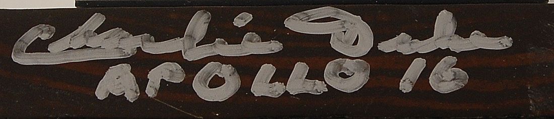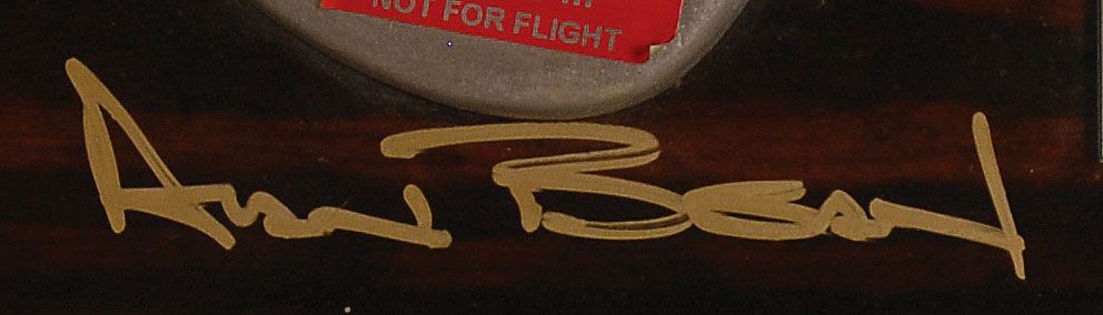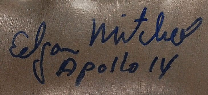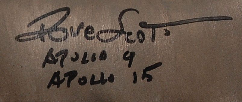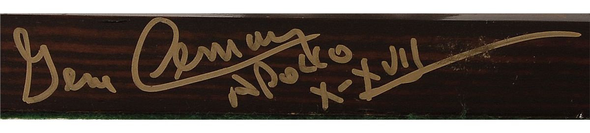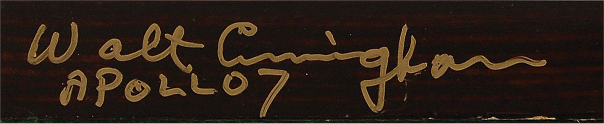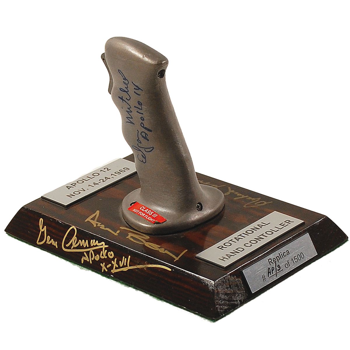 Limited edition replica Apollo rotational hand controller, #AP3/1500, affixed to a 5 x 8 wooden base, with two small plaques affixed to the base and a “Class III Not for Flight,” label affixed to the controller. Signed on the controller in blue felt tip, “Edgar Mitchell, Apollo 14,” and in black felt tip, “Dave Scott, Apollo 9, Apollo 15,” and signed on the wooden base in gold ink, “Alan Bean,” “Richard Gordon,” “Gene Cernan, Apollo X-XVII,” and “Walt Cunningham, Apollo 7.” In fine condition. Accompanied by a CD with photos of Cernan, Mitchell, and Scott taken at time of signing.