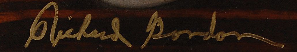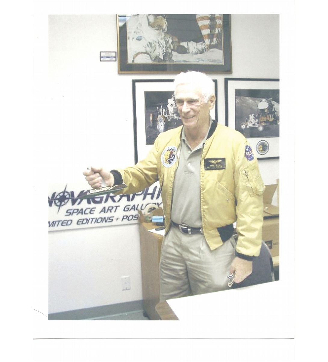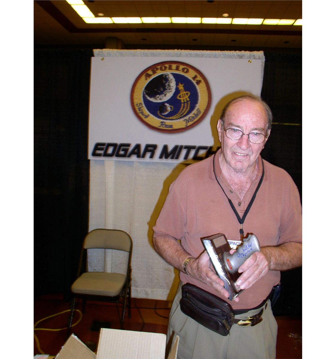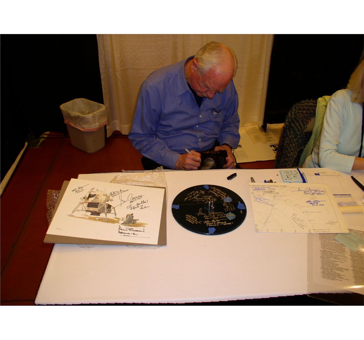 Limited edition replica Apollo rotational hand controller, #AP3/1500, affixed to a 5 x 8 wooden base, with two small plaques affixed to the base and a “Class III Not for Flight,” label affixed to the controller. Signed on the controller in blue felt tip, “Edgar Mitchell, Apollo 14,” and in black felt tip, “Dave Scott, Apollo 9, Apollo 15,” and signed on the wooden base in gold ink, “Alan Bean,” “Richard Gordon,” “Gene Cernan, Apollo X-XVII,” and “Walt Cunningham, Apollo 7.” In fine condition. Accompanied by a CD with photos of Cernan, Mitchell, and Scott taken at time of signing.