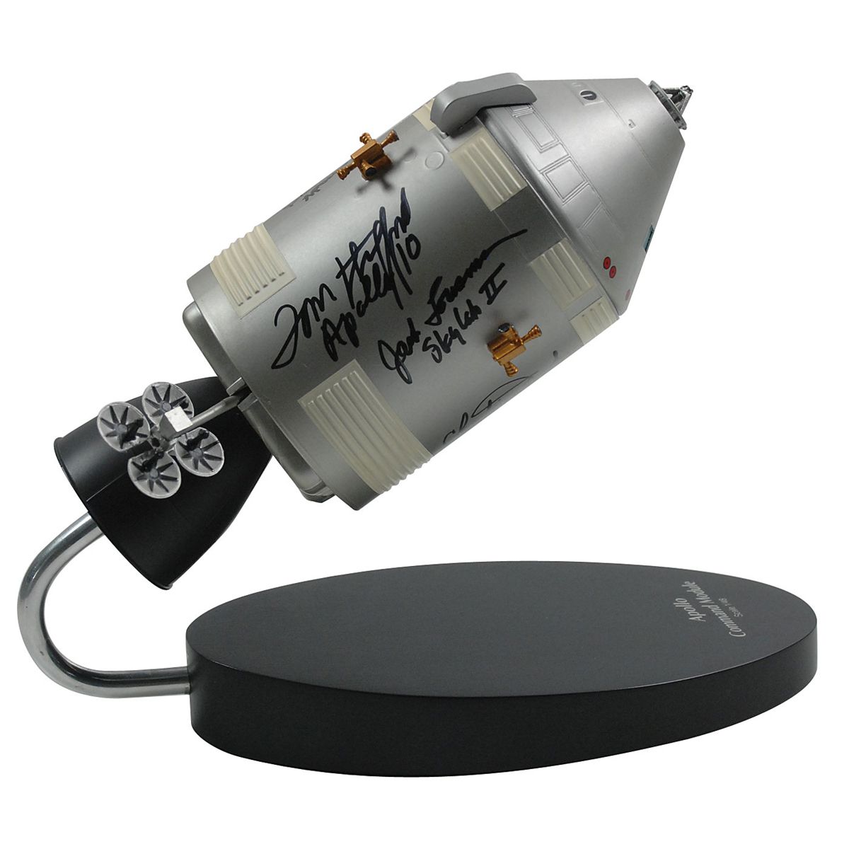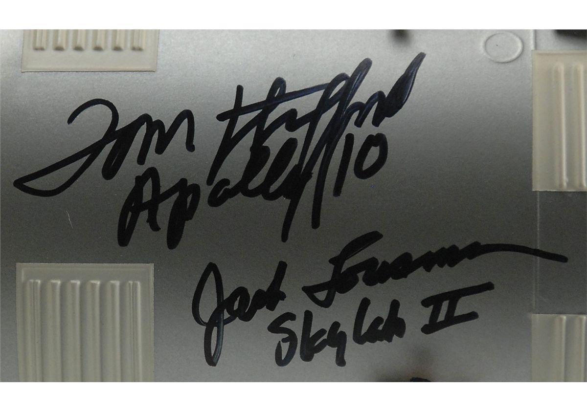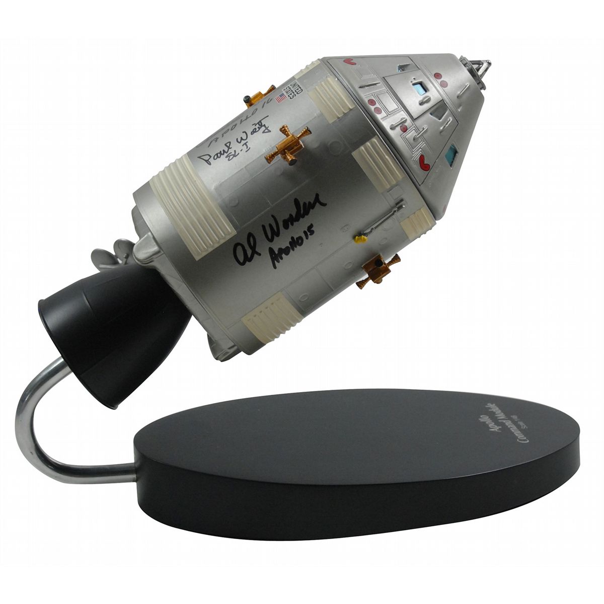 Model of the Apollo Command Module reproduced at a scale of 1:48, approximately 9? tall and 3.5? in diameter, signed on the sides in black felt tip by Al Worden, Ed Mitchell, Tom Stafford, Charlie Duke, Dave Scott, Jack Lousma, and Paul Weitz, with all adding their mission below. In fine condition. Consignor notes that the model was signed at the Air and Space Show in Titusville, Florida, in May 2004. Accompanied by a stand for the model.