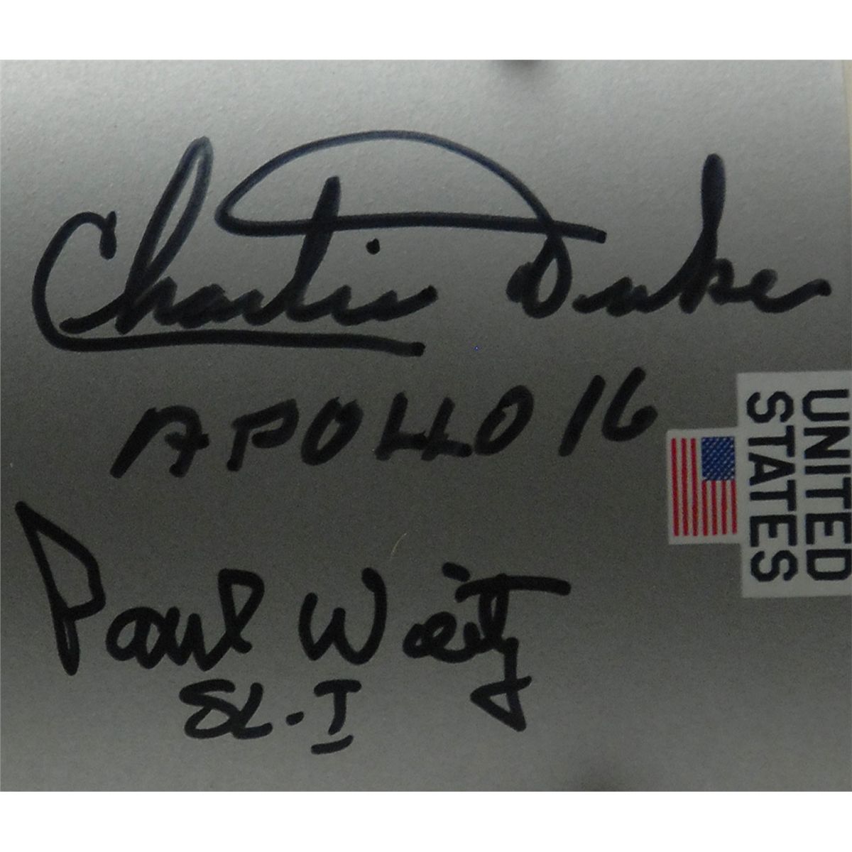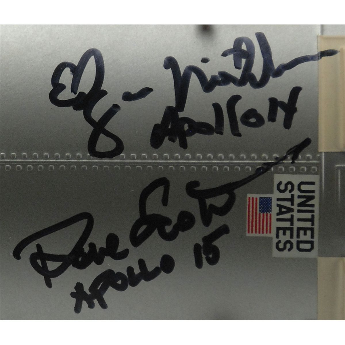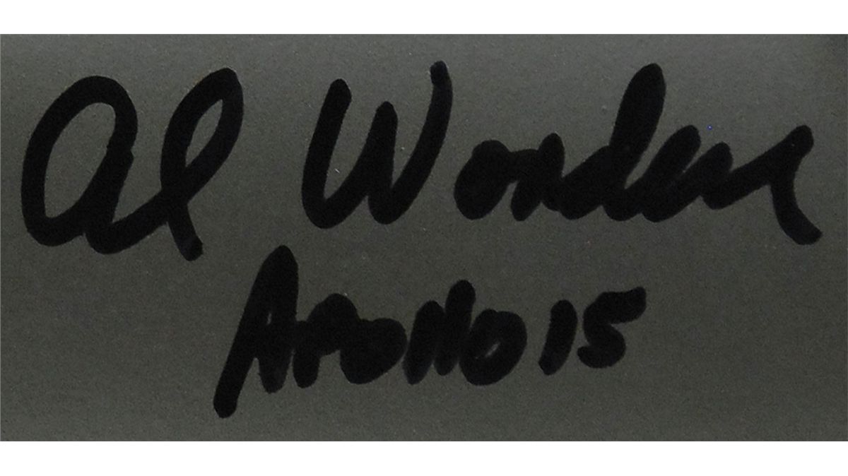 Model of the Apollo Command Module reproduced at a scale of 1:48, approximately 9? tall and 3.5? in diameter, signed on the sides in black felt tip by Al Worden, Ed Mitchell, Tom Stafford, Charlie Duke, Dave Scott, Jack Lousma, and Paul Weitz, with all adding their mission below. In fine condition. Consignor notes that the model was signed at the Air and Space Show in Titusville, Florida, in May 2004. Accompanied by a stand for the model.