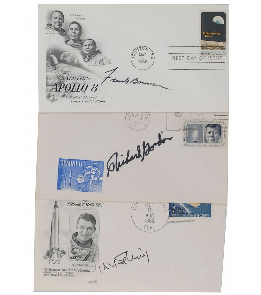 Three commemorative and first day covers with cachets honoring various space programs, each signed in felt tip by an Apollo astronaut. Signers are: Wally Schirra, Frank Borman, and Richard Gordon. In overall fine condition.