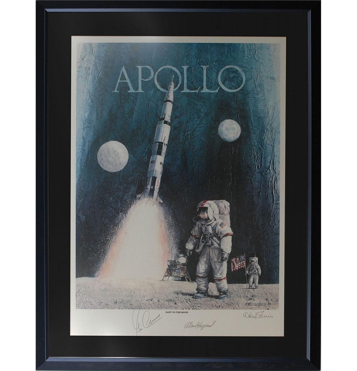 Color 19.5 x 27.5 print entitled ‘Navy to the Moon,’ signed in the lower border in pen by Gene Cernan, Alan Shepard, and Wally Schirra. Matted and framed to an overall size of 26 x 34.5. In fine condition.