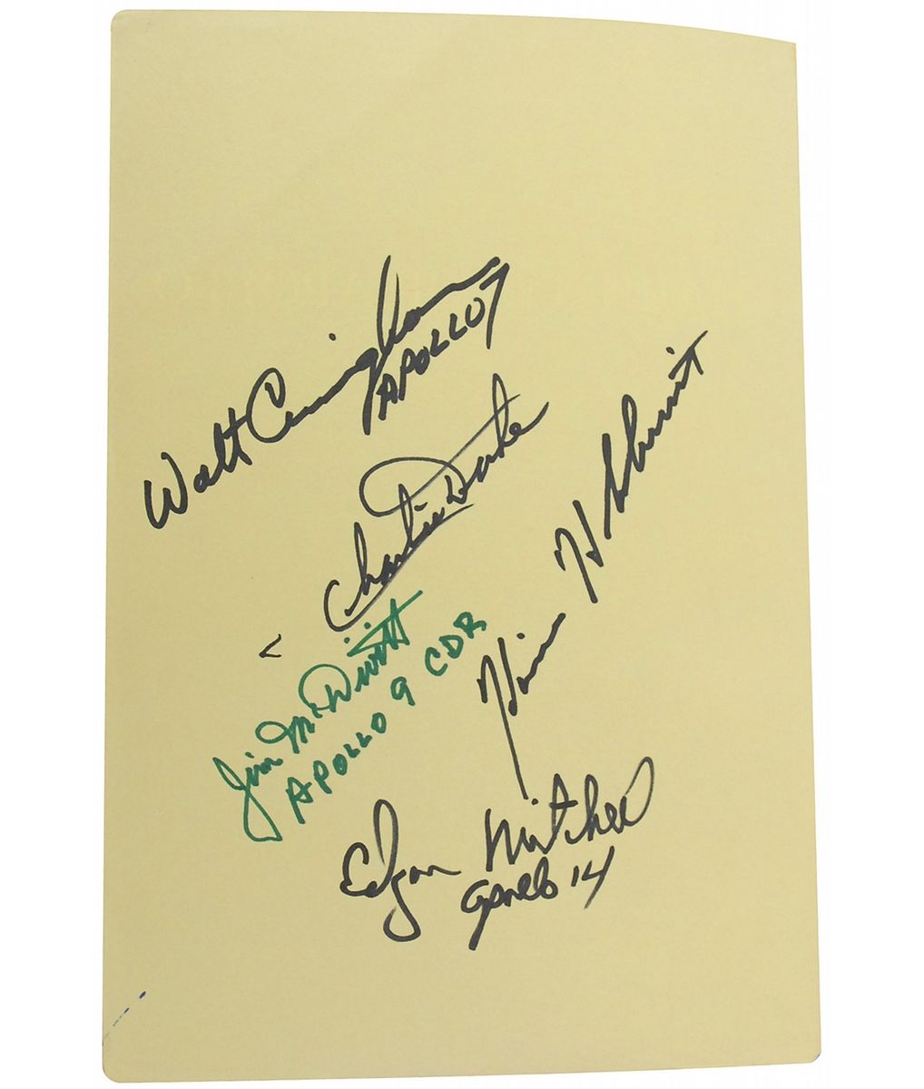 Signed book: Chariots for Apollo. Washington, DC: NASA, 1979. Softcover, 6.75 x 9.75, 538 pages. Signed on the inside front cover and half-title page by 14 Apollo astronauts: Walt Cunningham, Charlie Duke, Jim McDivitt, Harrison Schmitt, Edgar Mitchell, Gene Cernan, Alan Bean, Buzz Aldrin, Frank Borman, Dave Scott, Alan Shepard, Charles Conrad, James Lovell, and Richard Gordon. In fine condition, with a bit of scattered light surface wear to covers and spine.
