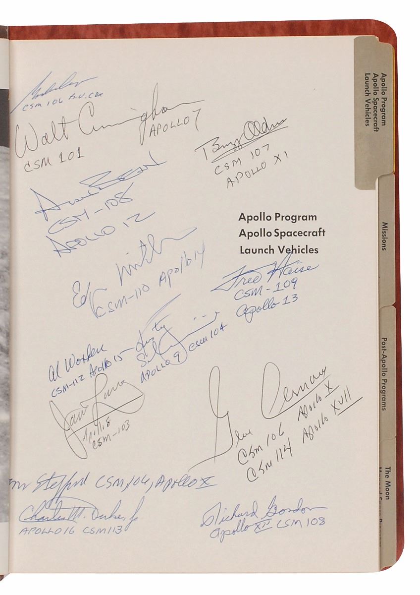 Apollo Spacecraft News Reference publication distributed to reporters by North American Rockwell in July 1969, 330 pages rife with illustrations, 9 x 11.5, signed on the title page in blue and black ballpoint by thirteen astronauts. Each has added his mission name, as well as the spacecraft number for the mission’s Command and Service Module, built by NAR. Signers are: Buzz Aldrin, Alan Bean, Edgar Mitchell, Charlie Duke, Gene Cernan, James Lovell, Tom Stafford, Fred Haise, Richard Gordon, Walt Cunningham, Rusty Schweickart, Al Worden, and Gordon Cooper. In fine condition. This exceptional group of astronauts includes at least one crew member from every manned Apollo mission, plus backup and Mercury 7 astronaut Gordon Cooper; these autographs are infrequently seen with the additional spacecraft designations.