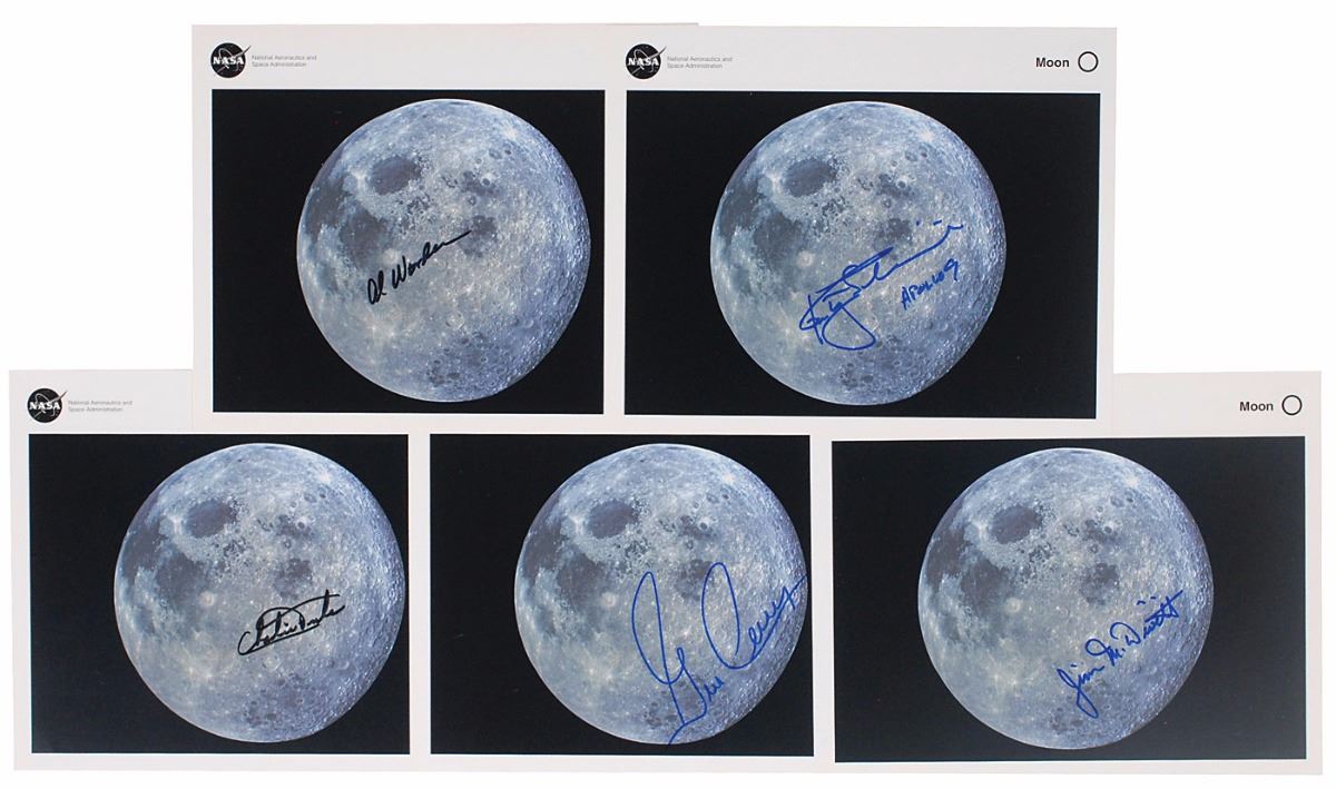 Five identical official color 10 x 8 NASA lithographs of the moon, each signed in blue or black felt tip by a different Apollo astronaut, including: Charlie Duke, Gene Cernan, Al Worden, Rusty Schweickart, and Jim McDivitt. In overall fine condition.