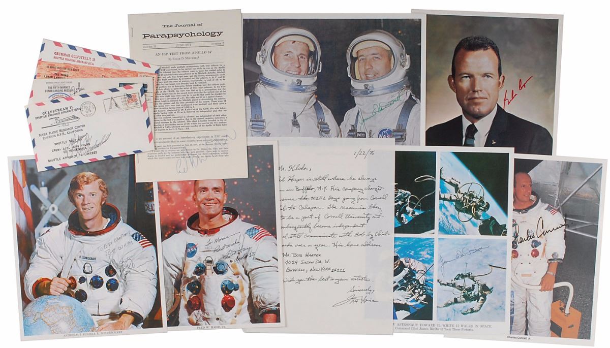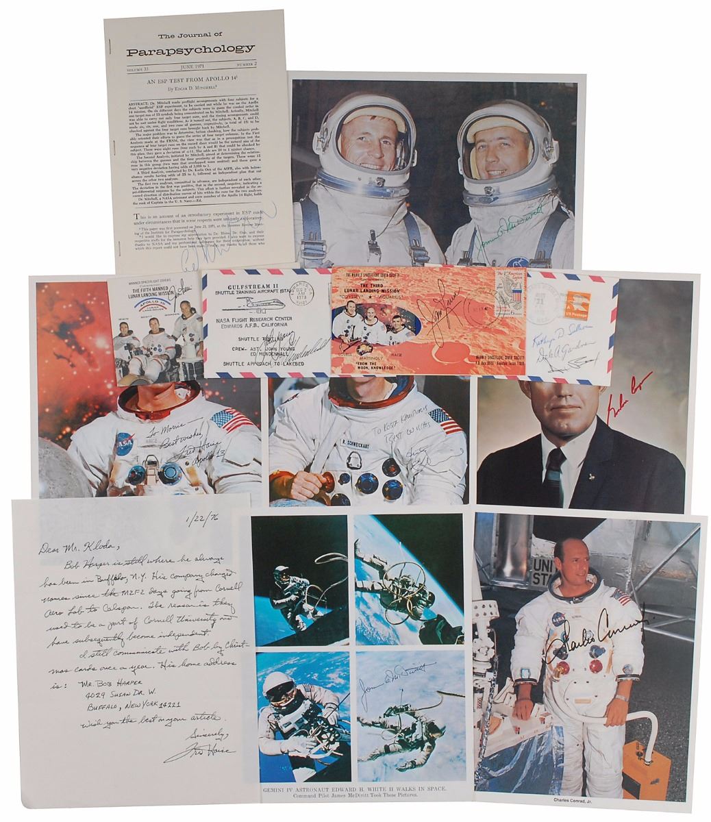 Collection of twelve items, each signed by an Apollo astronaut, including: James Lovell (cover); Alan Bean, Dale Gardner, and Kathryn D. Sullivan (cover); Jim Irwin (cover); John Young and Ed Mendenhall (cover); Jim McDivitt (two SPs); Charles Conrad (SP); Fred Haise (SP and ALS); Rusty Schweickart (SP); Gordon Cooper (SP); and Edgar Mitchell (booklet). In overall fine condition, with haloing to Conrad’s signature.