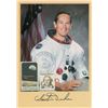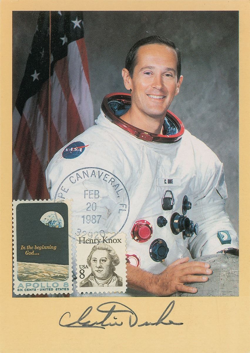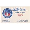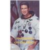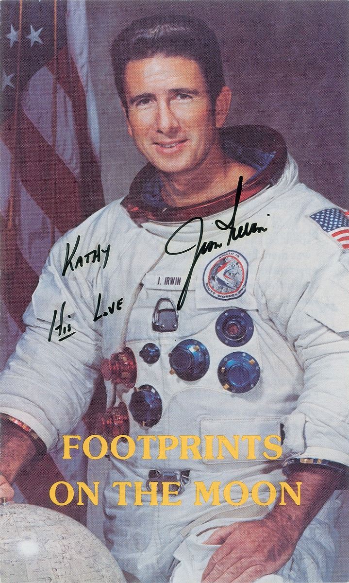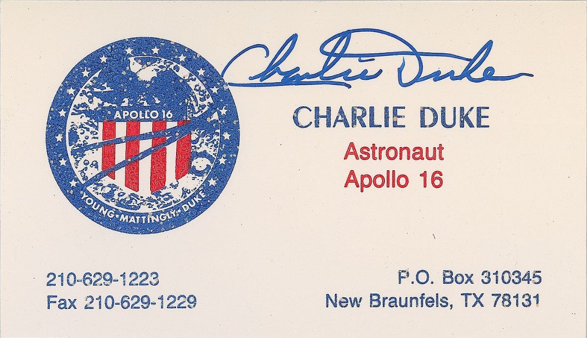 Eight items: a personal calling card for Charlie Duke, a color semi-glossy 4 x 5 photo of Duke, and a VIP card bearing a photo of Duke in his space suit, each signed in ballpoint or felt tip by Duke; a Footprints on the Moon pamphlet, signed and inscribed on the front in black felt tip by Jim Irwin; an invitation to an Apollo 9 reception, signed on the back cover in black ballpoint by Alan Bean; an official glossy 10.25 x 8 NASA photo of Gemini 6 pilots cutting a cake, signed in black felt tip by Tom Stafford; a satin-finish 8 x 10 photo of Rusty Schweickart holding a small model of a lunar lander, signed in blue felt tip by Schweickart; and a satin-finish 8 x 10 photo of Wally Schirra standing next to comedian Bill Dana, signed in gold ink by both. In overall fine condition.