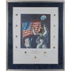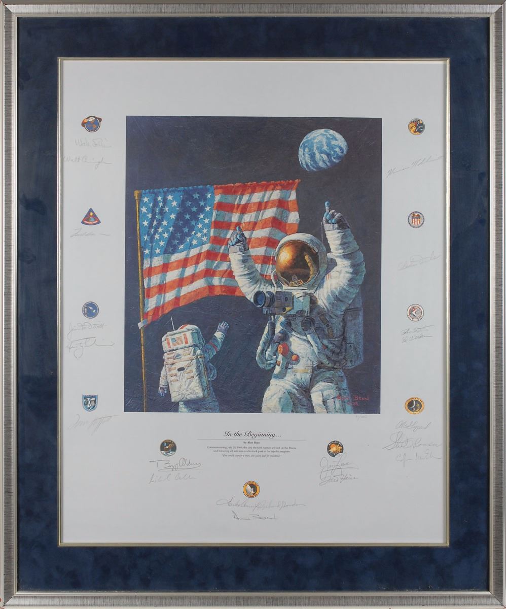 Amazing color limited edition 22.5 x 28 lithograph by Alan Bean entitled ‘In the Beginning…,’ numbered 811/1000, signed in pencil or ballpoint by 20 Apollo astronauts, each signing under his mission emblem. Signers are: Wally Schirra, Walt Cunningham, Frank Borman, Jim McDivitt, Rusty Schweickart, Tom Stafford, Buzz Aldrin, Michael Collins, Charles Conrad, Richard Gordon, Alan Bean, Fred Haise, James Lovell, Harrison Schmitt, Charlie Duke, Dave Scott, Al Worden, Alan Shepard, Stu Roosa, and Edgar Mitchell. Matted and framed to an overall size of 29.75 x 35.5.In fine condition. Accompanied by the original Greenwich Workshop folder. A visually stunning and very desirable collection of Apollo astronauts. Oversized. Please contact RR Auction for a shipping quote.