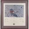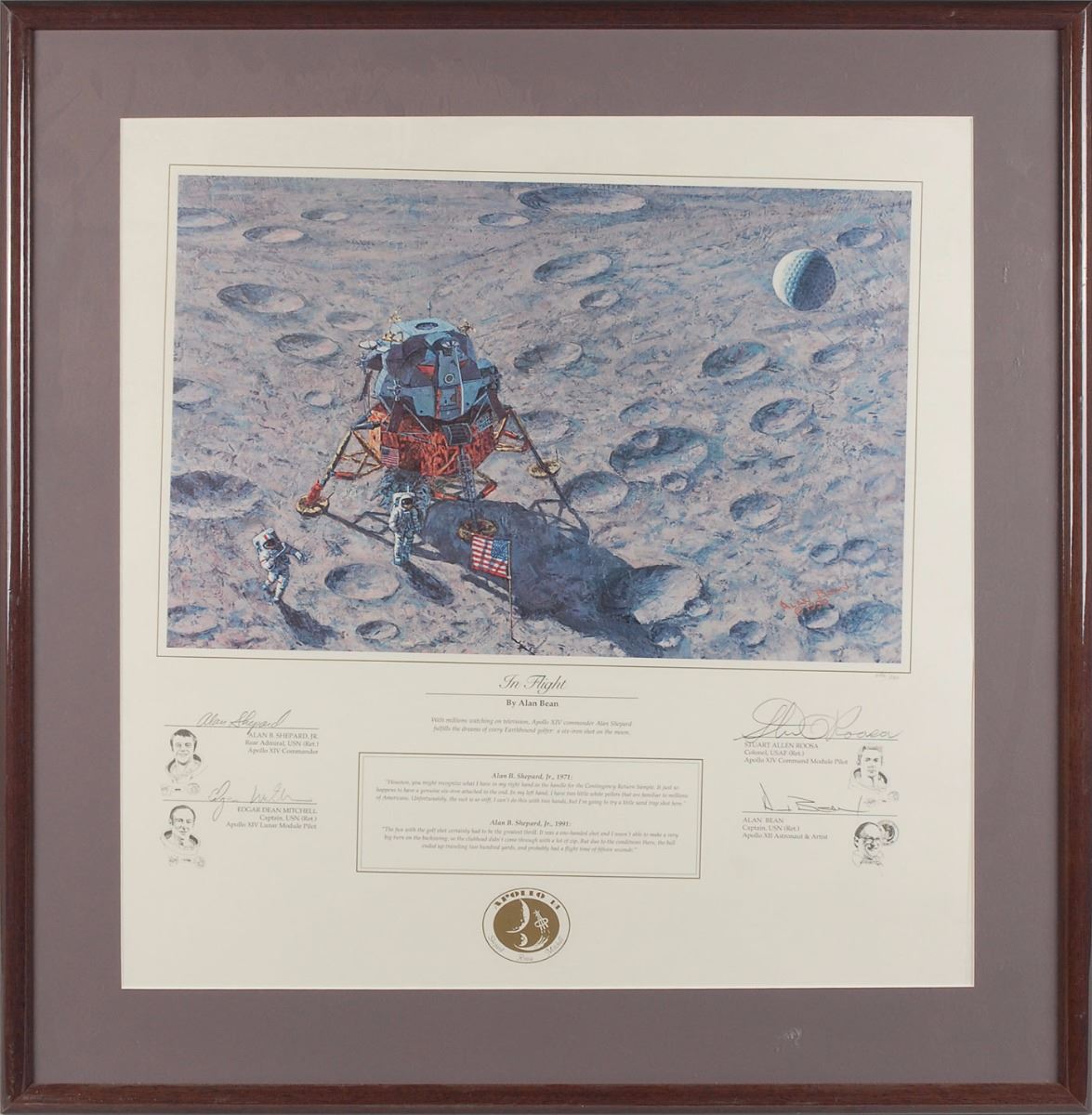 Gorgeous color limited edition 22 x 23 lithograph entitled ‘The Flight,’ depicting Alan Shepard hitting his famous lunar golf shot, numbered 686/850, signed in the lower border in pencil by crew members Alan Shepard, Edgar Mitchell, and Stuart Roosa, as well as astronaut and artist, Alan Bean. Matted and framed to an overall size of 28.25 x 29.75. Lithograph is slightly askew within frame, but could be easily recentered or removed. In fine condition, with a few trivial spots. Accompanied by the original Greenwich Workshop folder. Oversized. Please contact RR Auction for a shipping quote.
