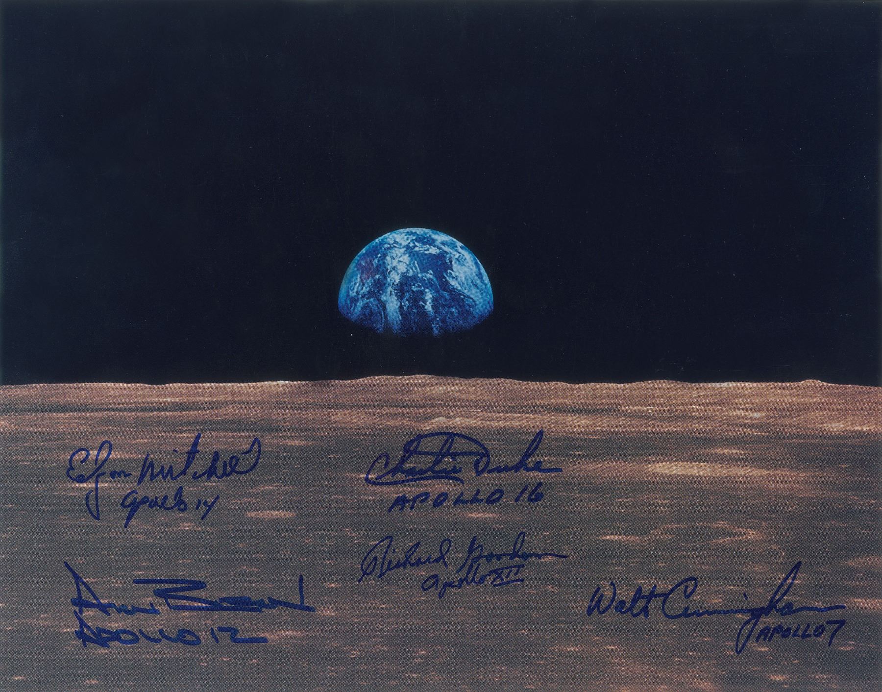 Superb color glossy 14 x 11 photo of planet Earth hanging above the undulating terrain of the lunar surface, signed in blue felt tip by Apollo astronauts: "Edgar Mitchell, Apollo 14," Charlie Duke, Apollo 16," "Alan bean, Apollo 12," "Richard Gordon, Apollo XII," and "Walt Cunningham, Apollo 7." In fine condition, with slight creases to right edge.
