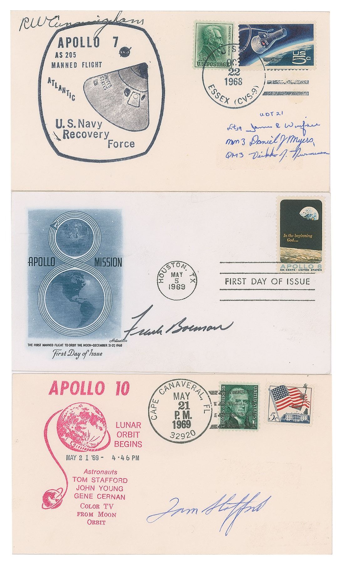 Three Project Apollo covers: a recovery cover for Apollo 7, postmarked on the USS Essex on October 22, 1968, signed in black ballpoint by Walt Cunningham; an FDC honoring Apollo 8, signed in black felt tip by Frank Borman; and a cover with a cachet honoring the beginning of lunar orbit for Apollo 10, postmarked at Cape Canaveral on the orbital insertion date of May 21, 199, signed in blue ballpoint by Tom Stafford. In fine condition, with a PSA/DNA label affixed to the reverse of the Stafford cover. Accompanied by a certificate of authenticity from PSA/DNA for Stafford's autograph.