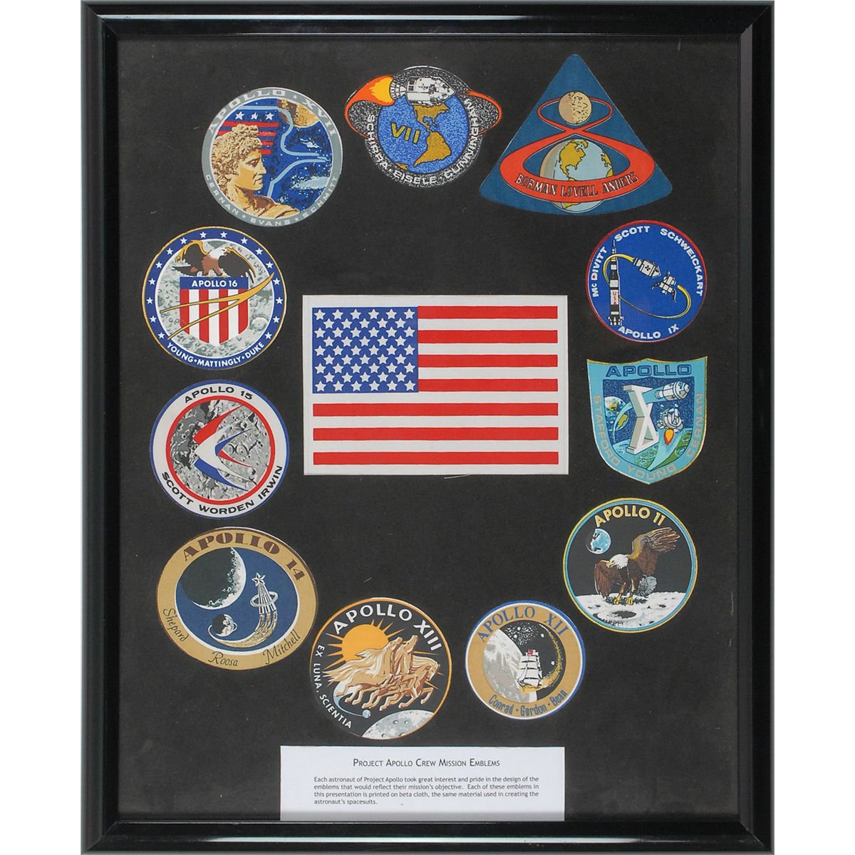 Collection of 12 Beta cloth patches bearing printed mission insignias for Apollo 7 through 17, most approximately 3.25? in diameter, and a 6.25 x 4.25 swatch of Beta cloth with a printed American flag. Matted and framed with a printed description to an overall size of 17 x 21. In fine condition.