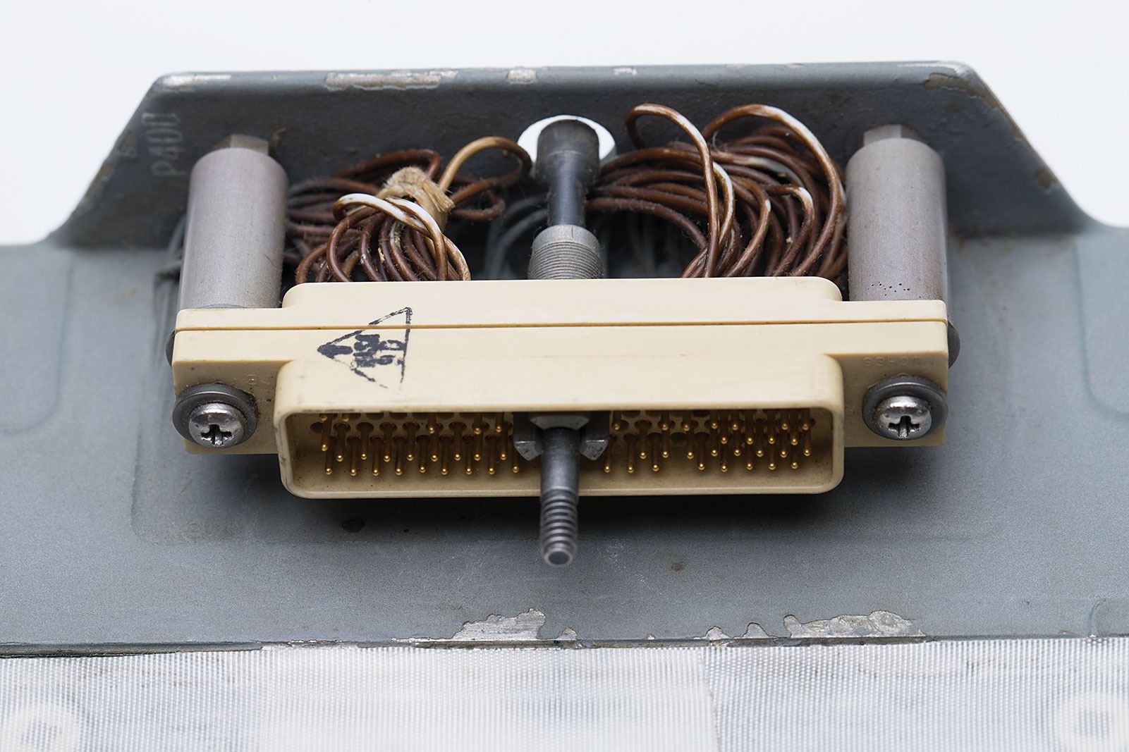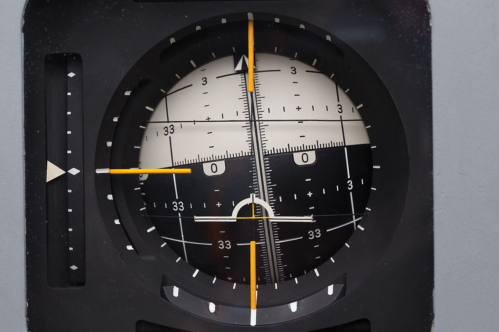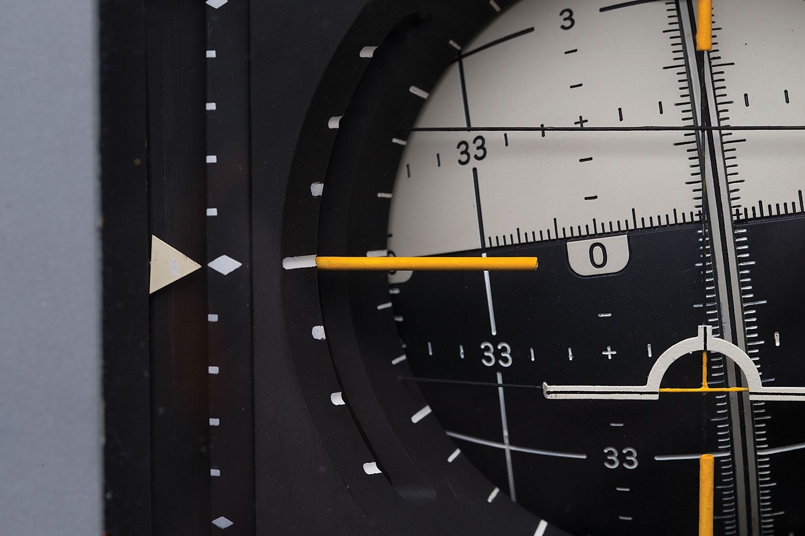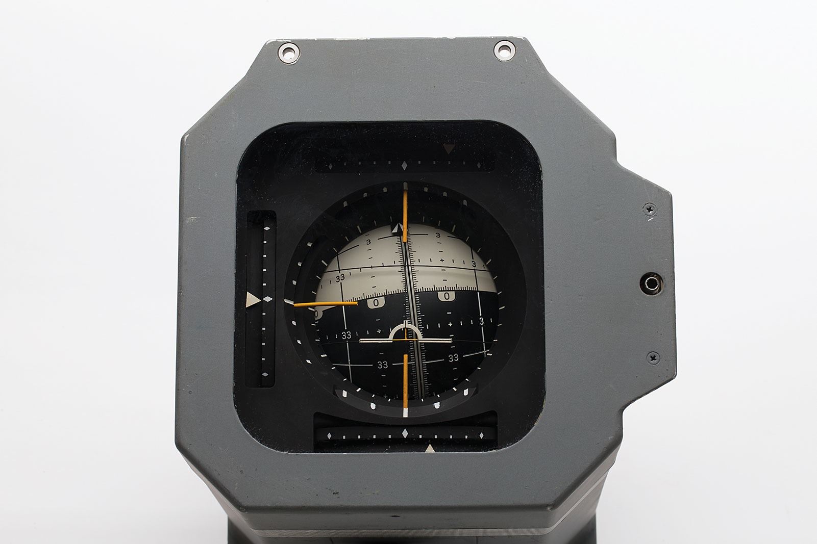 The red, black, and white ‘8 ball’ was used to define the relative position of the spacecraft in three-dimensional space. The pitch attitude is represented by the large semi-circles (horizontal relative to the numbers on the ball). The yaw attitude is represented by the small circles (vertical relative to the numbers on the ball). The semicircle immediately under the ‘wing’ is the current pitch angle. The two red circles centered at yaw 0 and 180 degree poles indicate where the inertial guidance gimbals are in danger of locking (gimbals from two axes aligning with each other) causing loss of attitude reference. Indicator has its original glass interface with three white bars over the top, which showed the error in each axis, from the desired value, by the displacement of the right and bottom of the ‘8 Ball,’ and also has its three rate needles on the sides of the display. Originally designed to be three different panel instruments, the astronauts, many of whom were pilots, lobbied for an all-in-one device similar to the artificial horizon indicator in airplanes.
