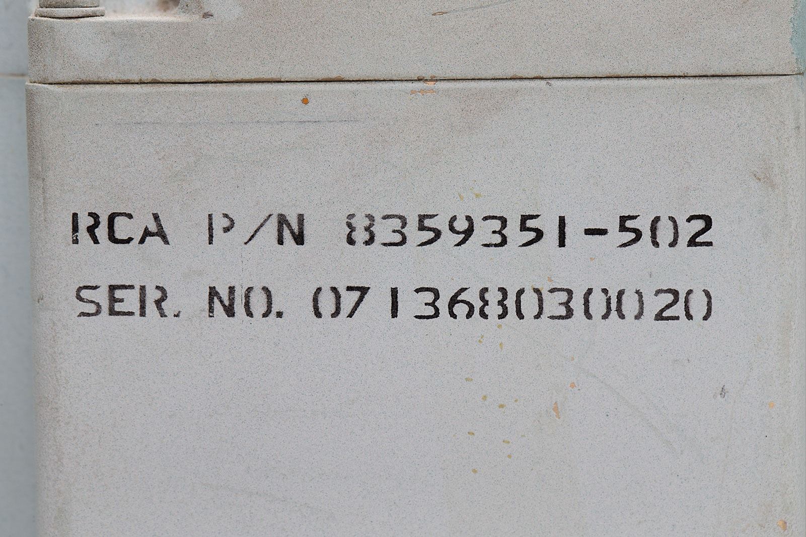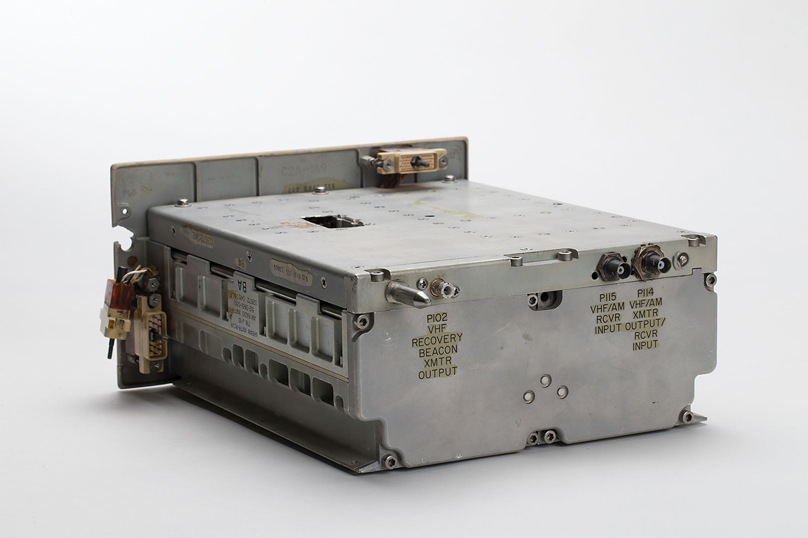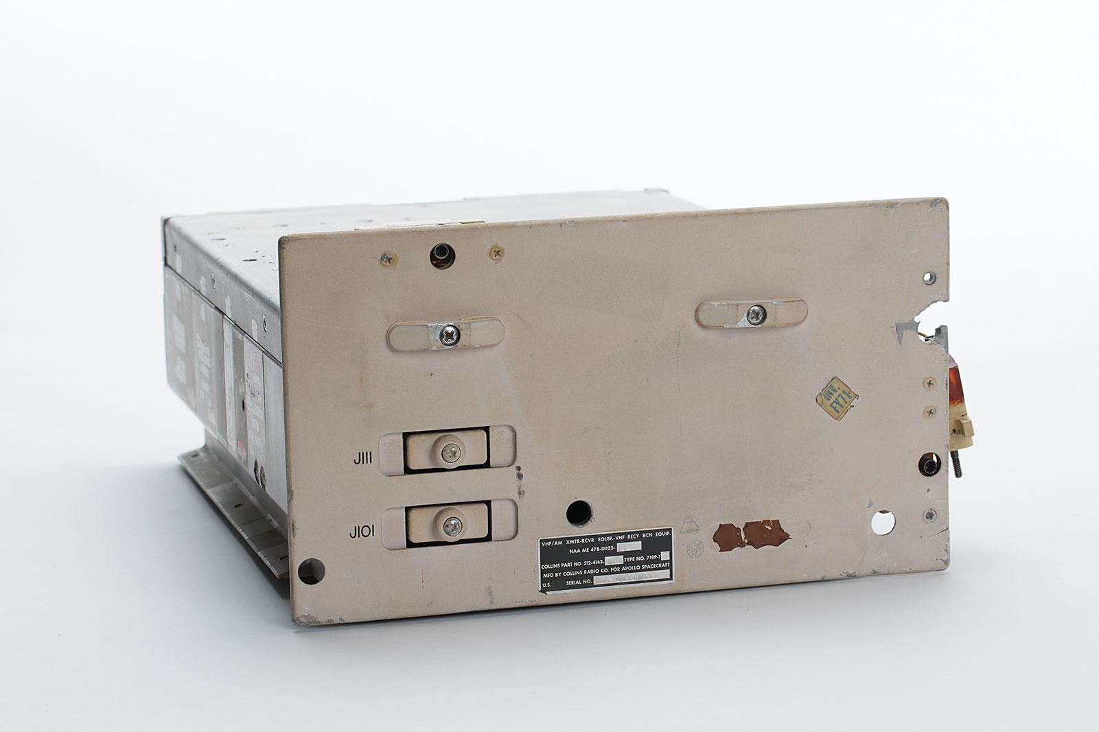 Engineering development model of the Apollo Block I/II VHF/AM radio, used in development and testing; these are identical to the flight units, but have some additional connectors for testing. The larger unit (Block I) measures 10.25? x 6? x 13?, and bears a tag on the front: "VHF/AM XMTR-RCVR EQUIP.-VHF RECY BCN EQUIP., NAA ME 478-0023-0043, Collins Part No. 512-4143-030, Type No. 718P-1F, Mfd by Collins Radio Co. for Apollo Spacecraft, Serial No. 026720020006." The smaller unit (Block II) measures 4.75? x 6? x 12?, and bears a tag on the front: "VHF/AM Equipment, NAA S&ID PN ME-478-0067-0009, Contract No. NAS 9-150, Date of Mfr. 12.23.68, Collins Radio Co. PN 514-0021-016, Mfd. by RCA for the Apollo Spacecraft, Serial No. 071368030020." Also bears a "Class III, Not For Flight" label, and handwritten annotation, "S/C 110." In fine condition. The “S/C 110” notation means that this unit was likely installed in CSM-110 (Apollo 14) at one time. It was then likely removed either because of an anomaly found during preflight testing or for postflight evaluation. There is no documentation to confirm either scenario.