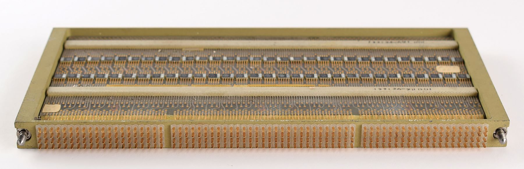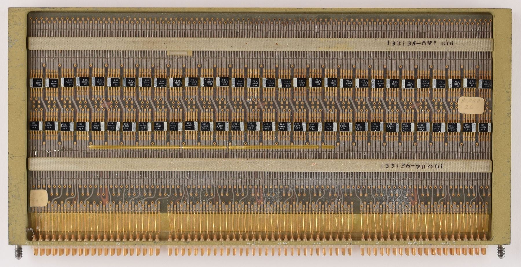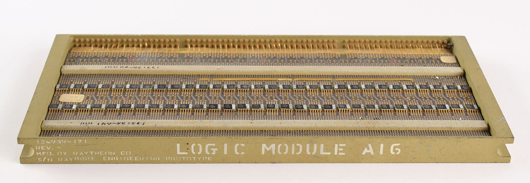 Engineering prototype of a logic module for the Block II Apollo Guidance Computer (AGC), measuring 9.75? x 4.75? x .5?, marked on the edge: "Logic Module A16, 124939-171, Rev. -, Mfd. by Raytheon Co., S/N Raytheon Engineering Prototype." The open sides of the module reveal a total of 120 Fairchild integrated circuit chips (two rows of 30 on each side), all marked, "FSL, 1090-1, 503." These chips each contain six transistors comprising two 3-input NOR gates. In fine condition.