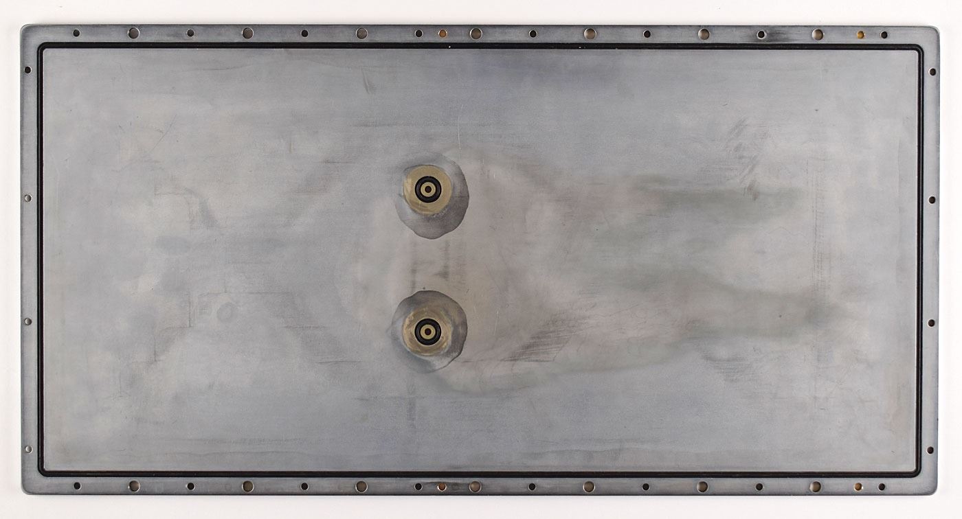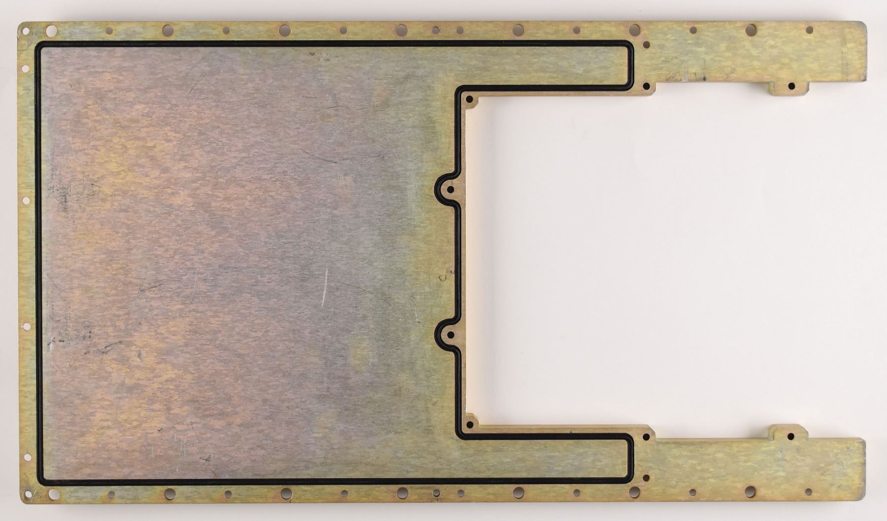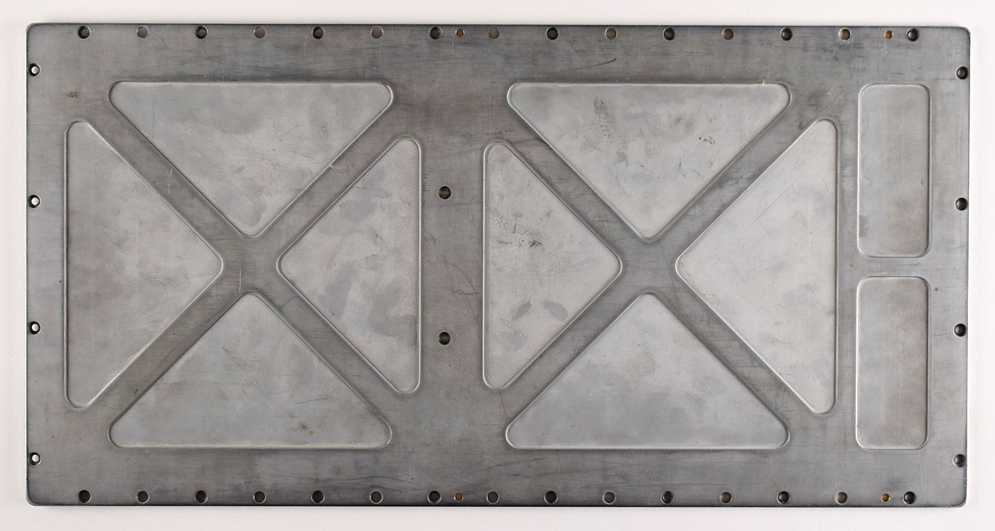 Top and bottom plates designed for the Block II Apollo Guidance Computer (AGC), both featuring X-shaped patterns. The top plate (likely magnesium) measures 21.75? x 12.5? x .5?, and the bottom plate (likely aluminum) measures 24.25? x 12.5? x .25?. Both cover plates retain their inherent rubber gaskets, designed to hermetically seal the computer's components inside. This X-shaped design pattern is the version that flew on the AGC. In fine condition.