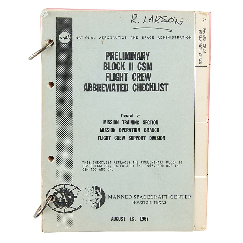 Official ring-bound NASA checklist entitled "Preliminary Block II CSM Flight Crew Abbreviated Checklist," used by Russell A. Larson of MIT's Instrumentation Laboratory, prepared by the Manned Spacecraft Center's Spacecraft Systems Branch, 6 x 8, August 18, 1967, marked on the front cover in felt tip, "R. Larson." The abbreviated checklist covers prelaunch checks, boost-insertion and separation, abort procedures, guidance and control, navigation programs, rendezvous and docking, crew transfer intravehicular activity, systems management, and emergency procedures. In fine condition, with light wear.