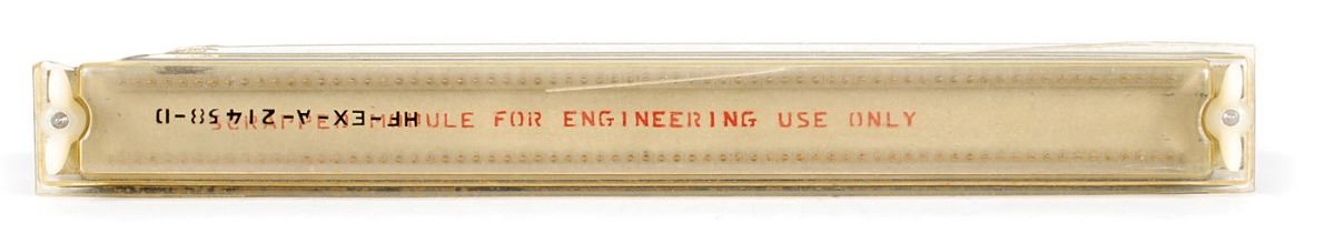 Rare Apollo Guidance Computer (AGC) module, 9.75 x 1 x 1.75, labeled on the red exterior, “Erasable Driver Module B9–10, NASA No. 2003114-021. Mfd by Raytheon Co., S/N Ray. 100.” Also marked, “Scrapped Module, For Engineering Use Only.” In very good to fine condition. This module was responsible for providing required voltages to read and write from the 2K word erasable memory in the AGC. The AGC was the primary computer onboard the Command Module and Lunar Module used to autonomously navigate and fly the spacecraft throughout all phases of the lunar mission. An extremely desirable space-age computer piece.